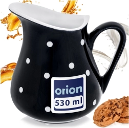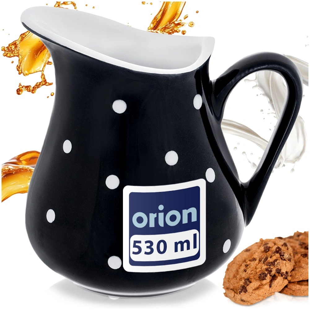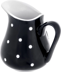 Elegant keramisk kande med en kapacitet på 480 ml i sort med hvide prikker, ideel til servering af mælk, fløde, vand, lemonade og saucer. Den har et ergonomisk håndtag og en formet hældetud for præcis hældning uden sprøjt. Den er egnet til opvaskemaskine og mikrobølgeovn og skiller sig flot ud på bordet og køkkenbordet takket være det dekorative udseende.