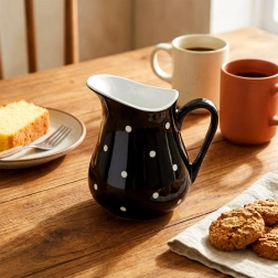 Denne praktiske og stilfulde kande kombinerer funktionalitet med et attraktivt design. Fremstillet af kvalitetskeramik i sort med hvide prikker, kompletterer den enhver morgenmad, kaffeservering og festlig borddækning. Takket være den universelle kapacitet på 480 ml egner den sig til mælk, fløde, saucer og forfriskende drikke.