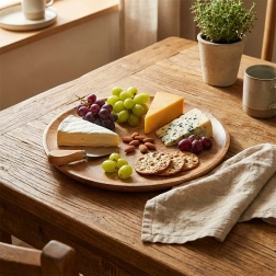Dette runde serveringsfad i mangotræ (20 × 20 × 2,5 cm) er en alsidig hjælper til både hverdags- og festbordet. Den naturlige overflade med synlig åretegning giver servering af oste, frugt, desserter eller brød et unikt præg og en hyggelig atmosfære.