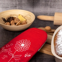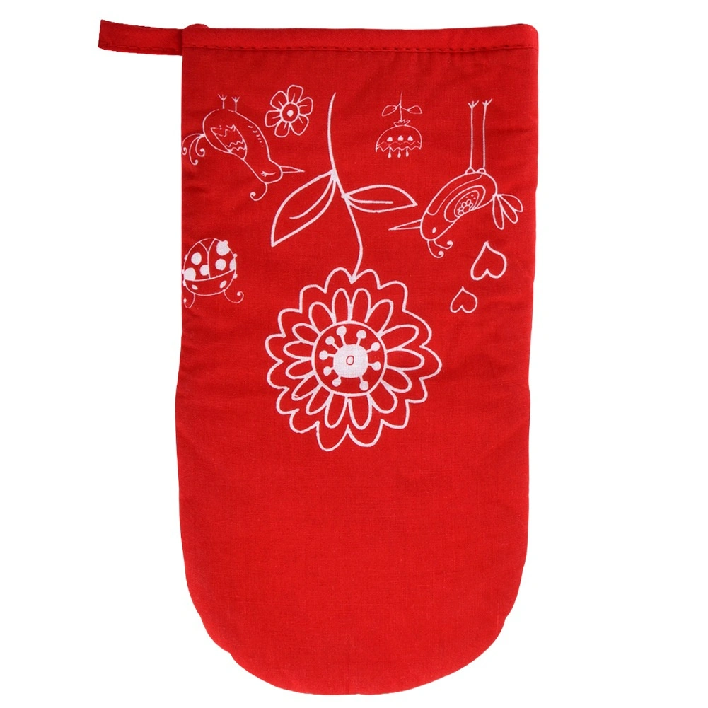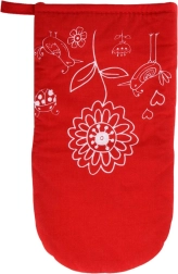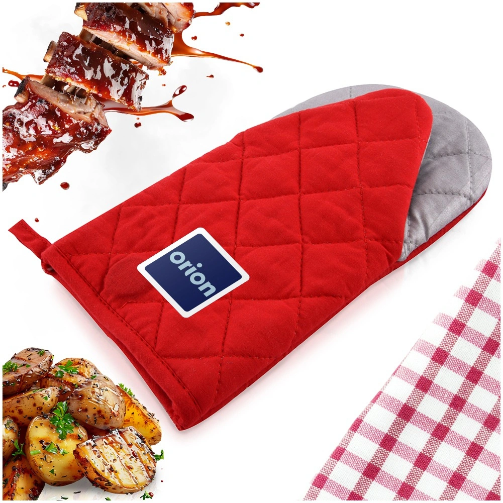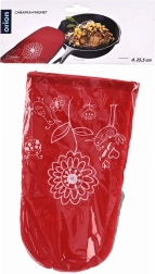 Denne røde køkkenhandske kombinerer et attraktivt udseende med høj funktionalitet. Ydersiden i slidstærk polyester suppleres af en grebflade i bomuld med teflonoverflade, som giver pålidelig varmebeskyttelse ved både madlavning og bagning. Handsken slutter godt til hånden og gør det sikkert at bære varme bageplader, bradepander og gryder.