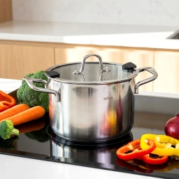 Gryden er perfekt til supper, gullash, braiseret kød og one-pot-retter. Låget af hærdet glas med silikoneelementer muliggør sikker sigtning uden ekstra redskaber og kontrolleret dampudslip. Takket være det elegante design kan du servere direkte på bordet.