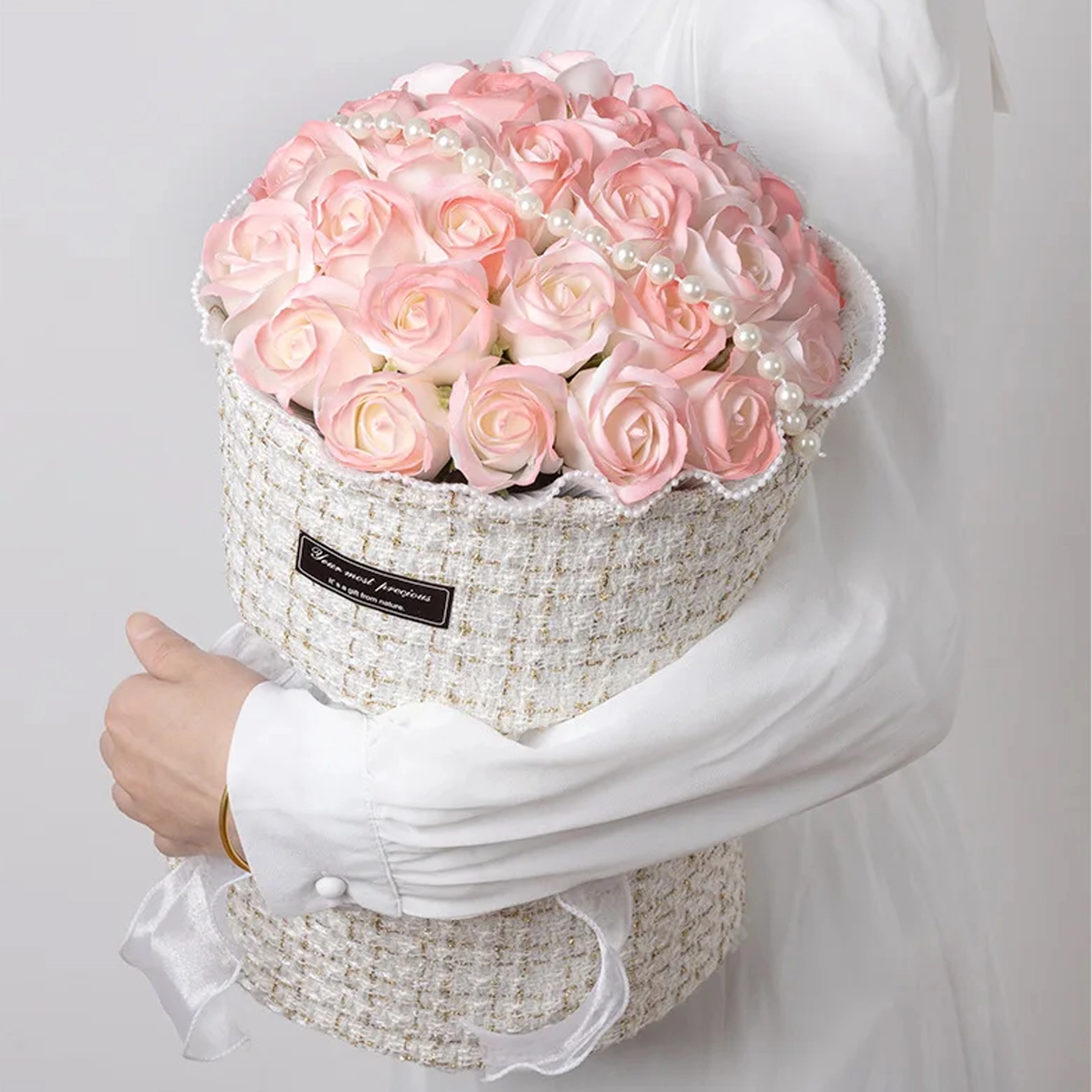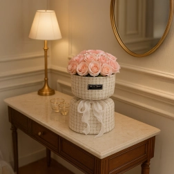 Denne elegante sæ t af lyserøde sæberoser i en tekstilbeklædt hatteæske bringer romantisk stemning til ethvert bord, kommode eller sofabord. De blide rosenuancer, accentueret med perler og LED-lys, skaber et sofistikeret arrangement, der ligner friske blomster, men ikke kræver nogen pleje.