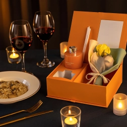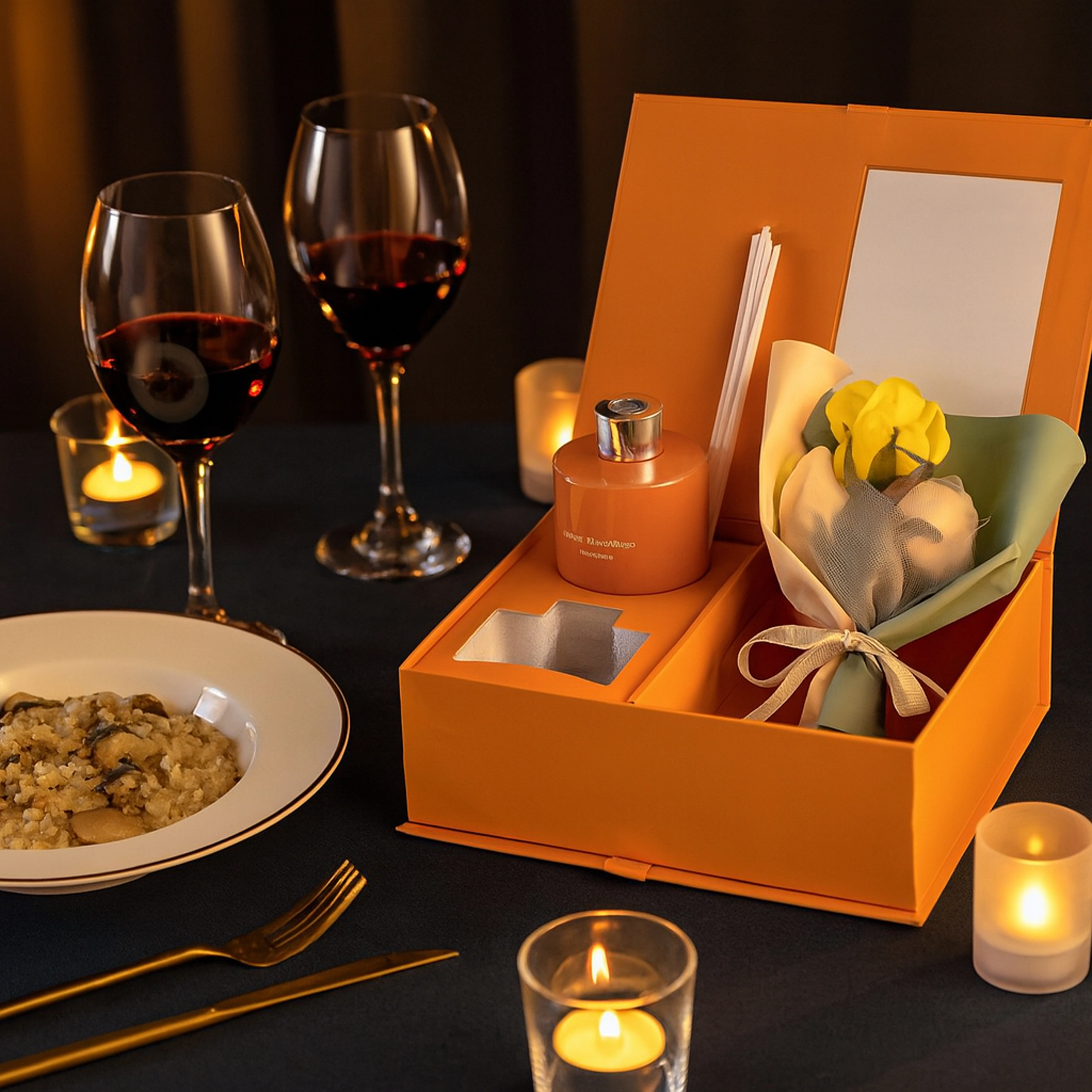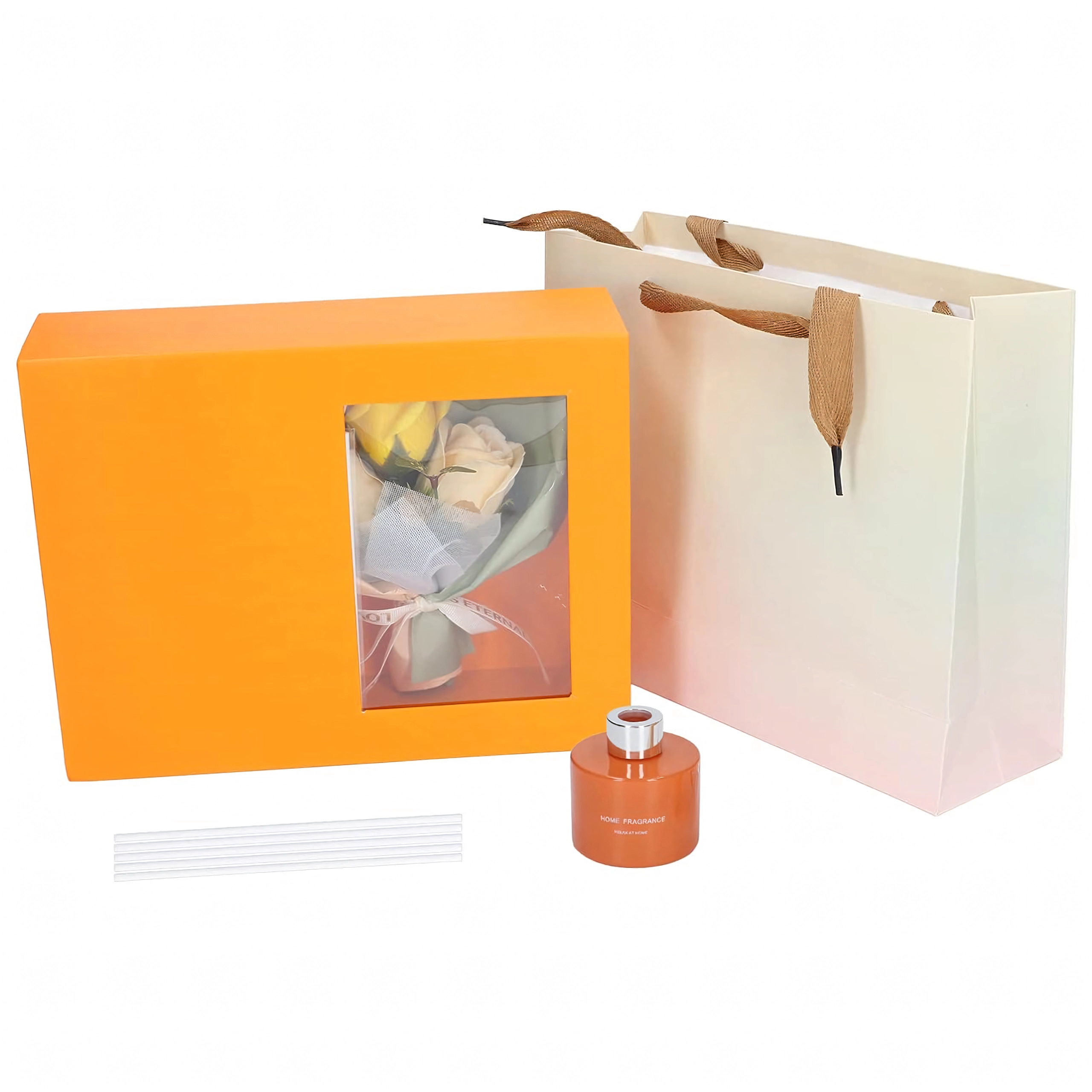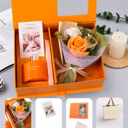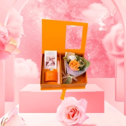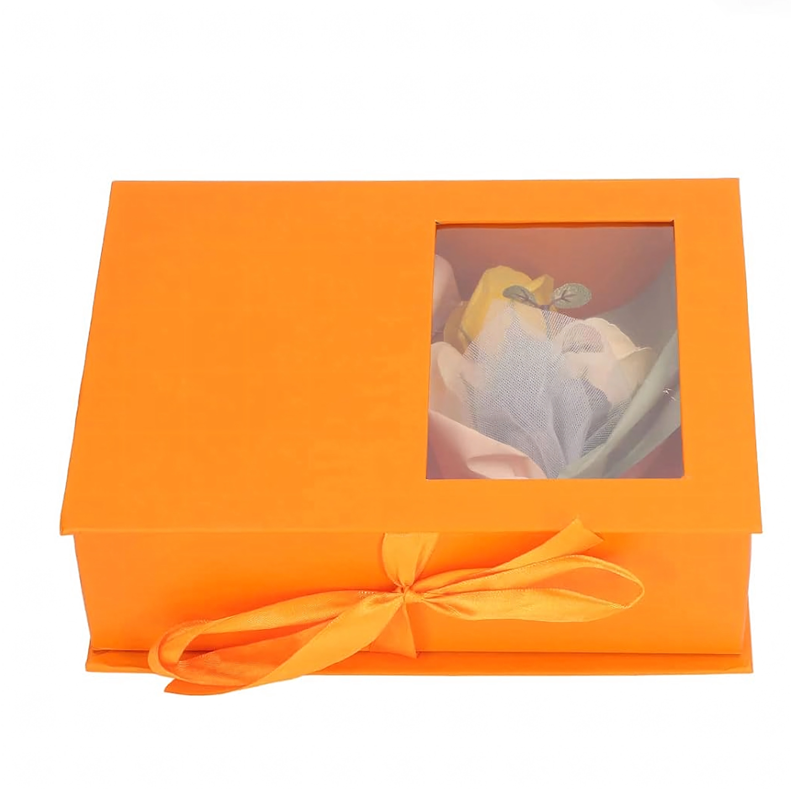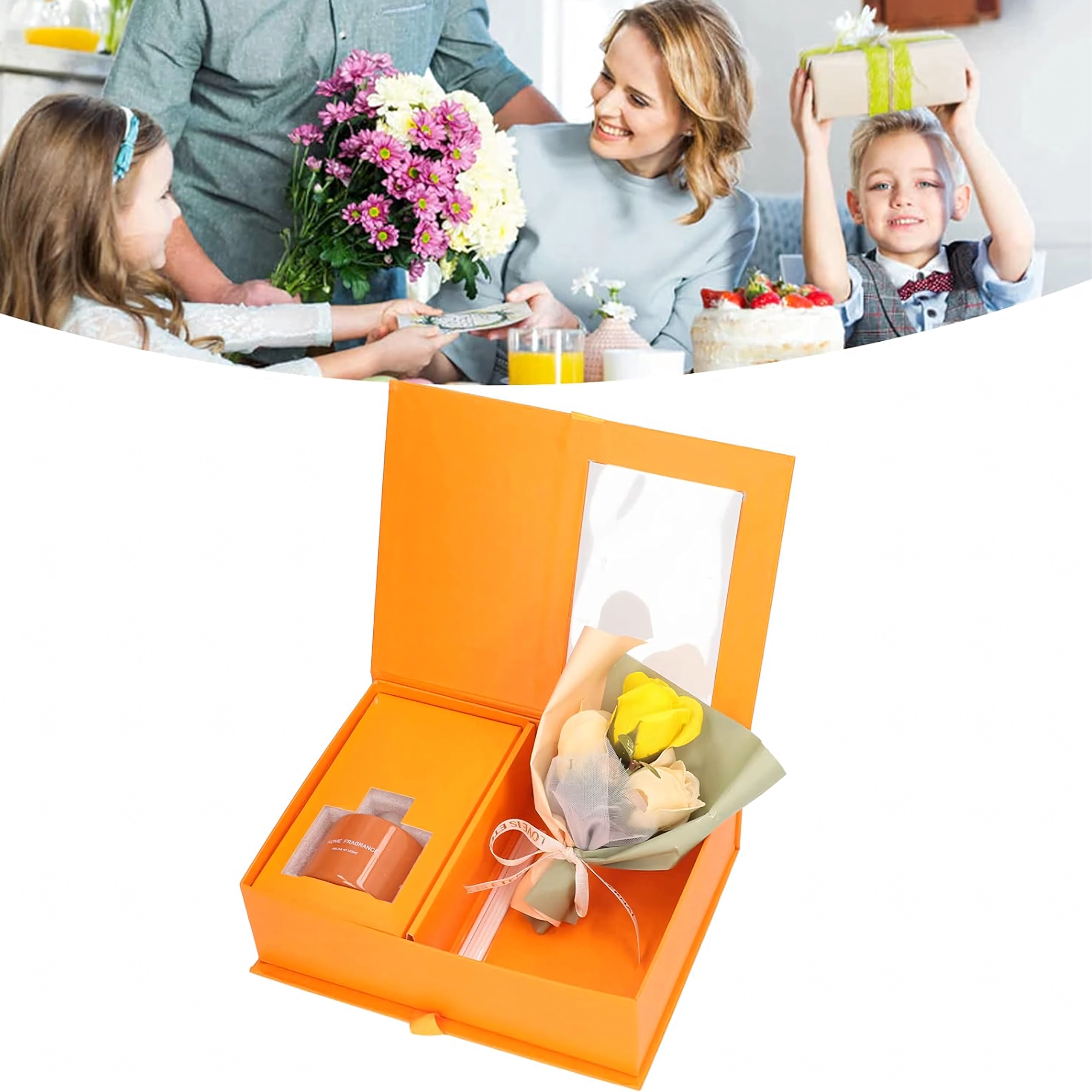 Den solide orange æske med vindue og sløjfe virker repræsentativ; medfølger gør en lille buket dekorative roser for et perfekt afstemt gaveudtryk.
