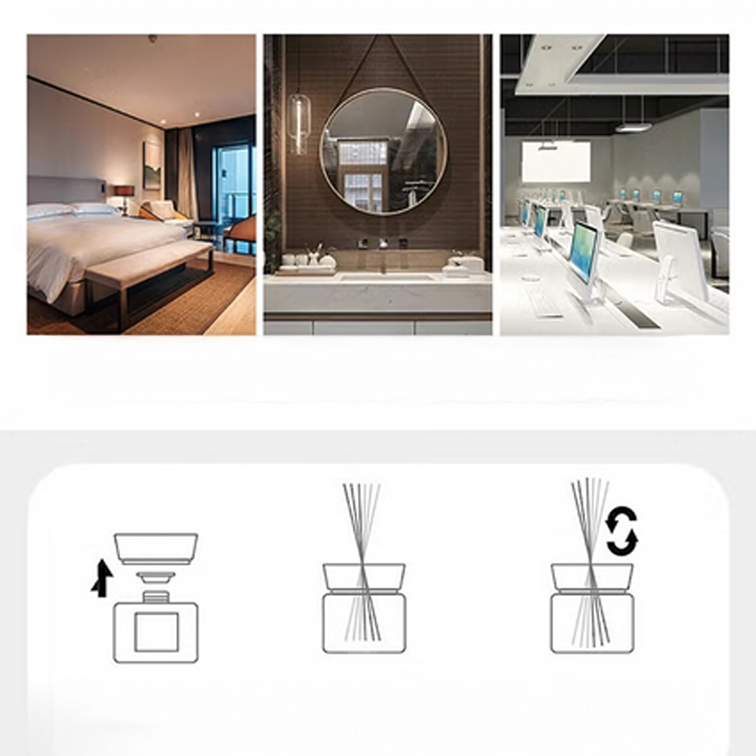 Rattanpindene frigiver gradvist duften uden behov for flamme eller stikkontakt. Velegnet til soveværelse, badeværelse og kontor; for at genopfriske intensiteten skal pindene blot vendes.