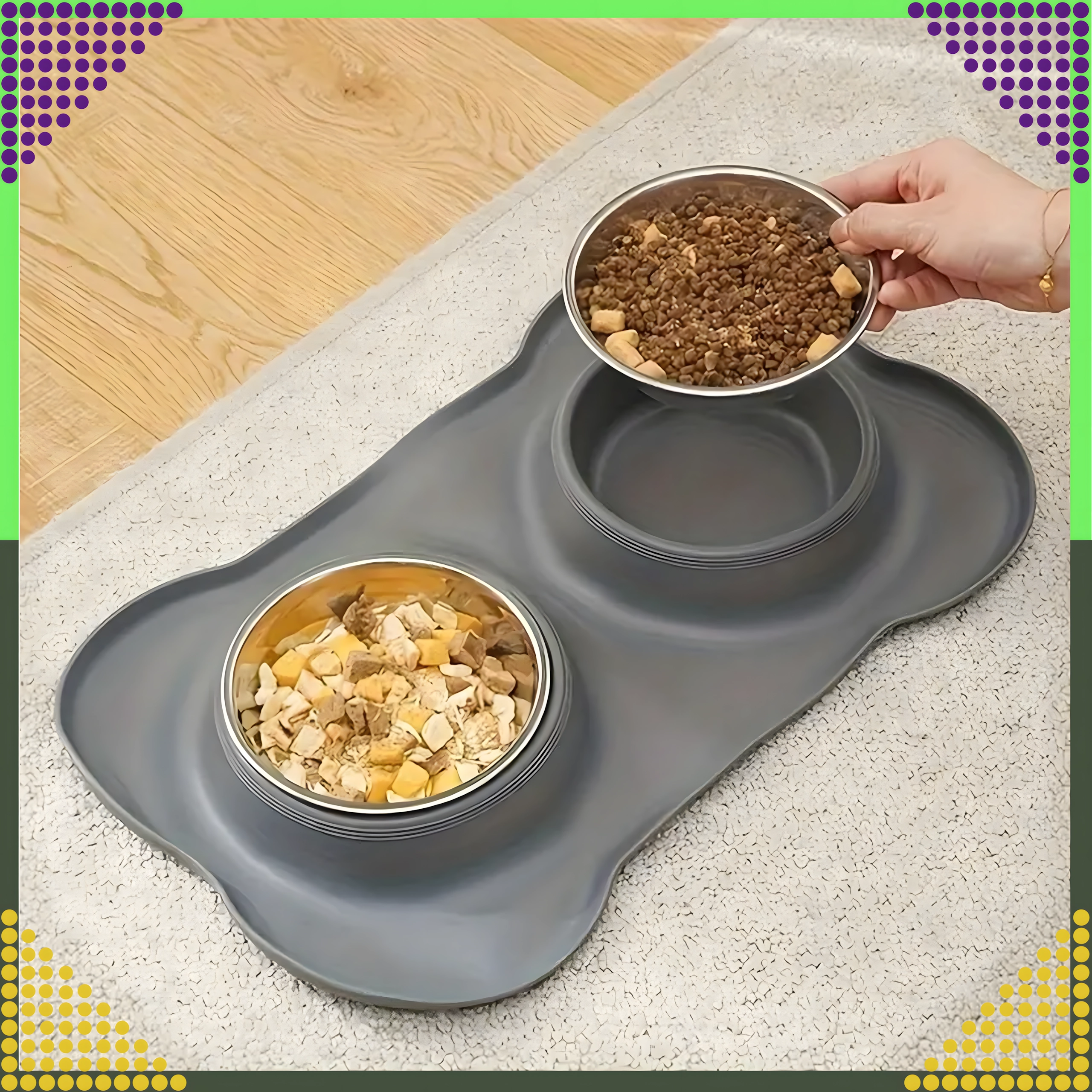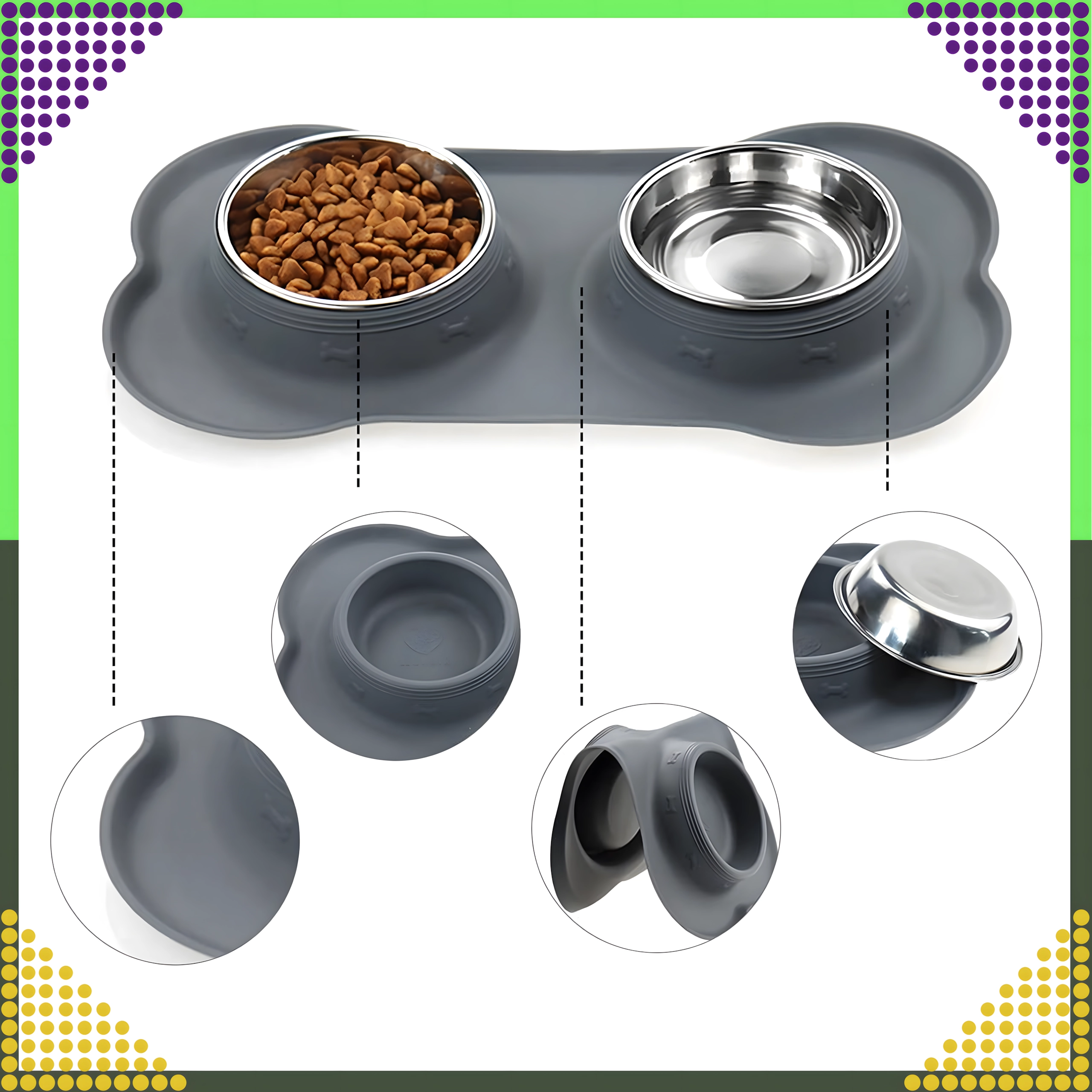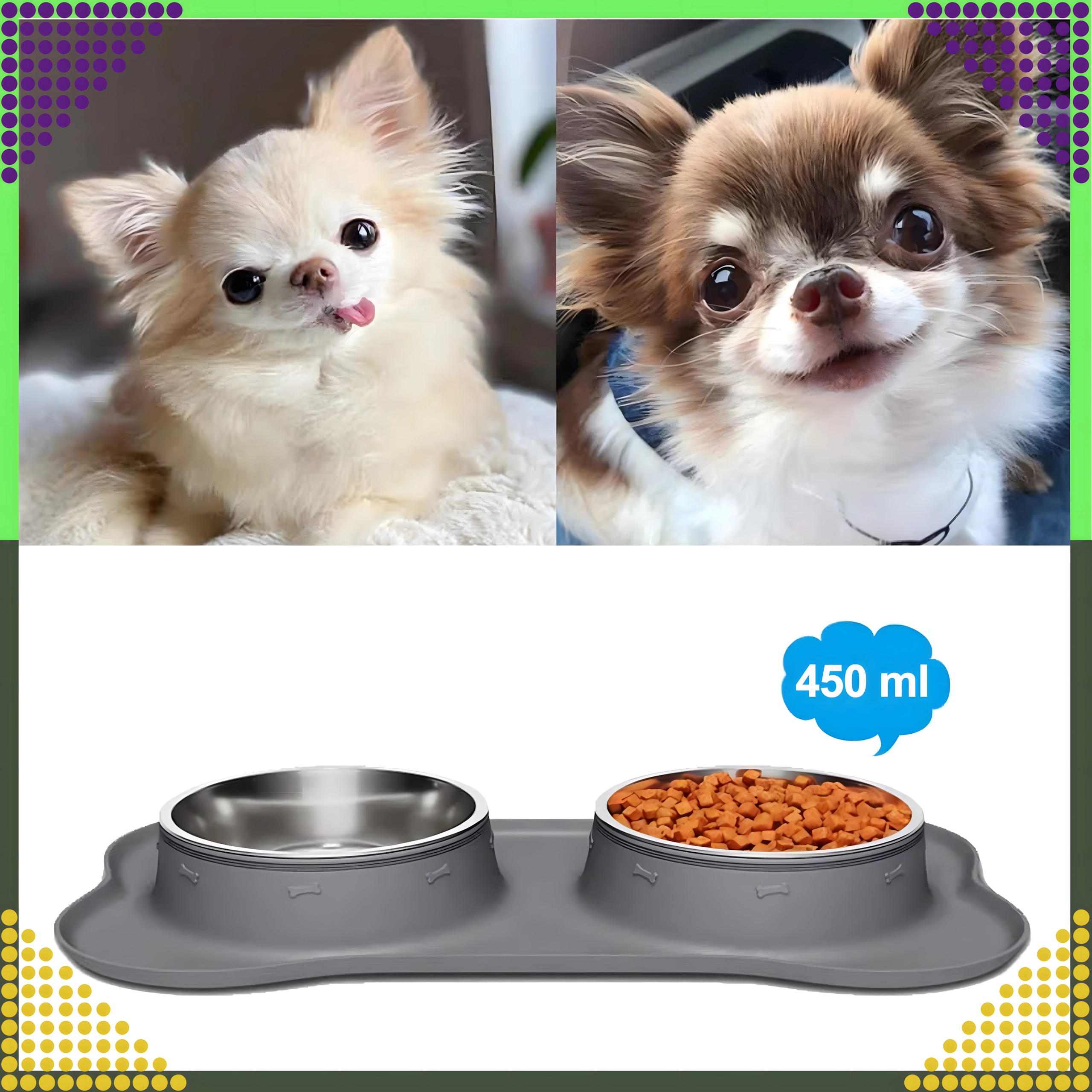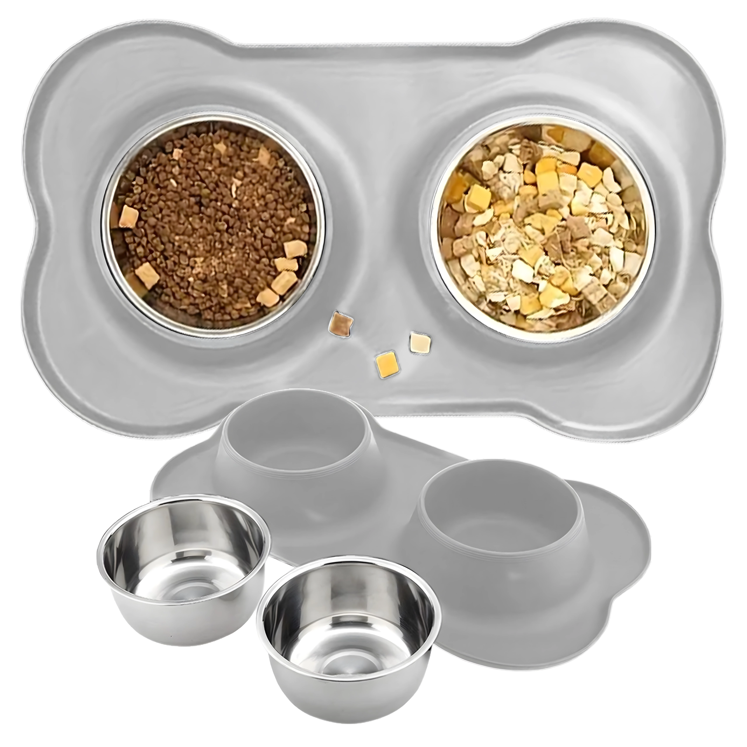 Praktisk dobbelt skål til både hunde og katte med en kapacitet på 2 × 450 ml, der kombinerer to aftagelige skåle i rustfrit stål og en skridsikker silikonemåtte formet som et ben. Måtten hjælper med at begrænse spild, holder skålene på plads og gulvet rent og tørt. Skålene kan tåle opvaskemaskine, og hele sættet er let at vedligeholde.