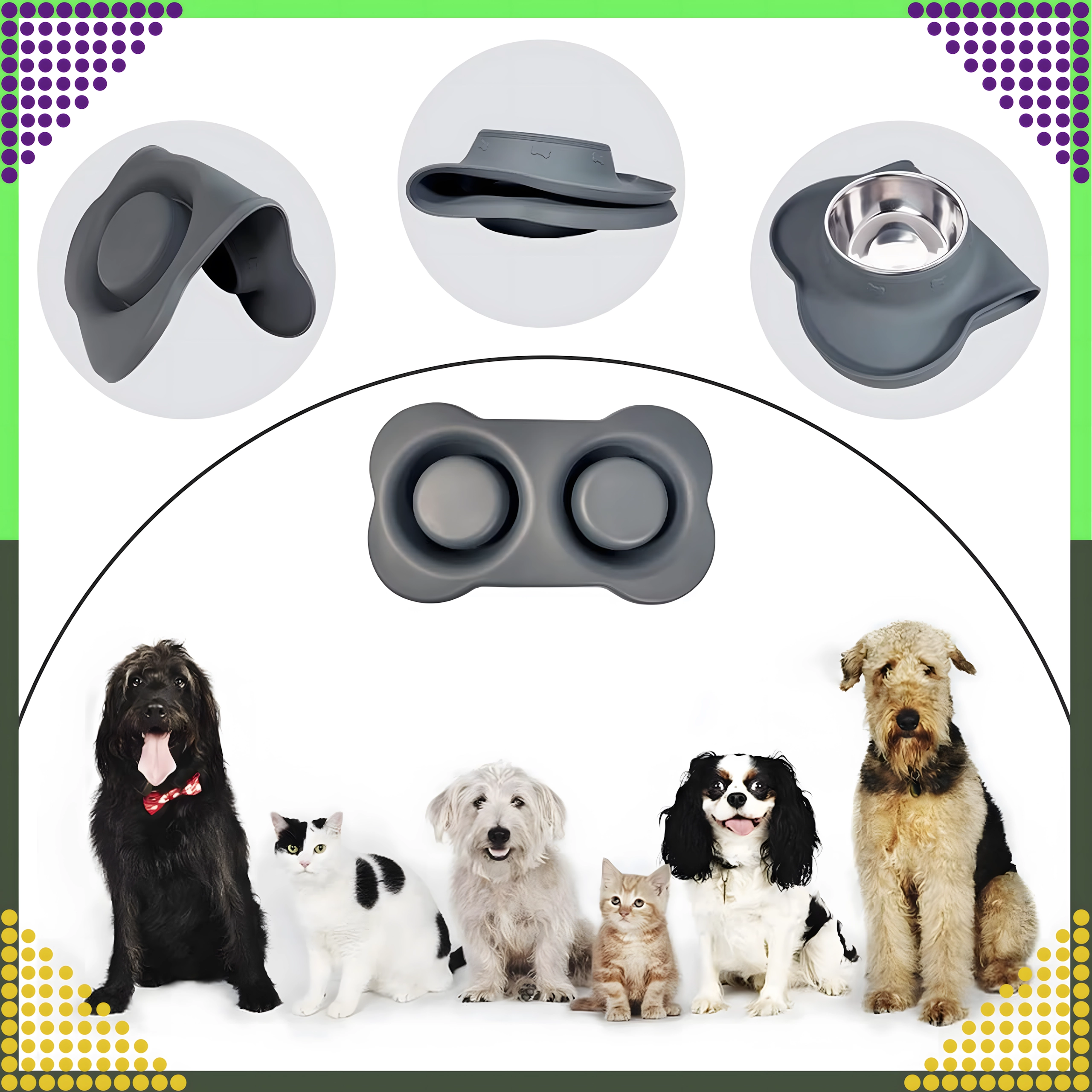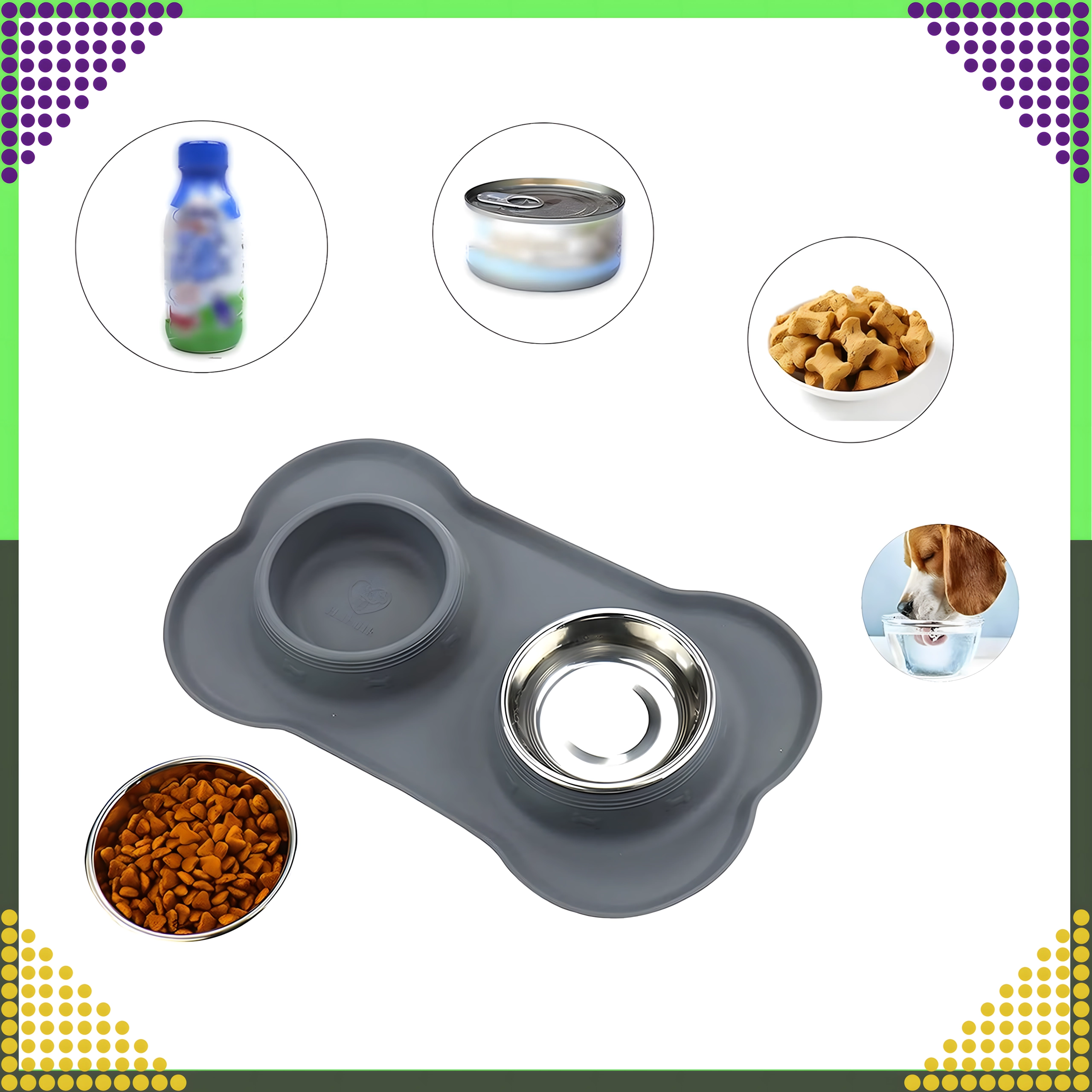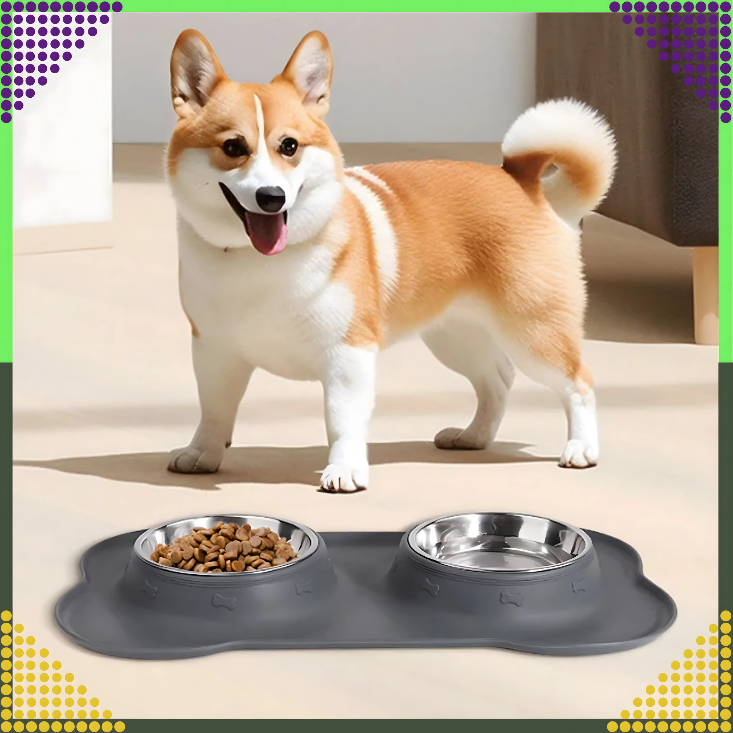 Praktisk dobbelt skål til både hunde og katte med en kapacitet på 2 × 450 ml, der kombinerer to aftagelige skåle i rustfrit stål og en skridsikker silikonemåtte formet som et ben. Måtten hjælper med at begrænse spild, holder skålene på plads og gulvet rent og tørt. Skålene kan tåle opvaskemaskine, og hele sættet er let at vedligeholde.