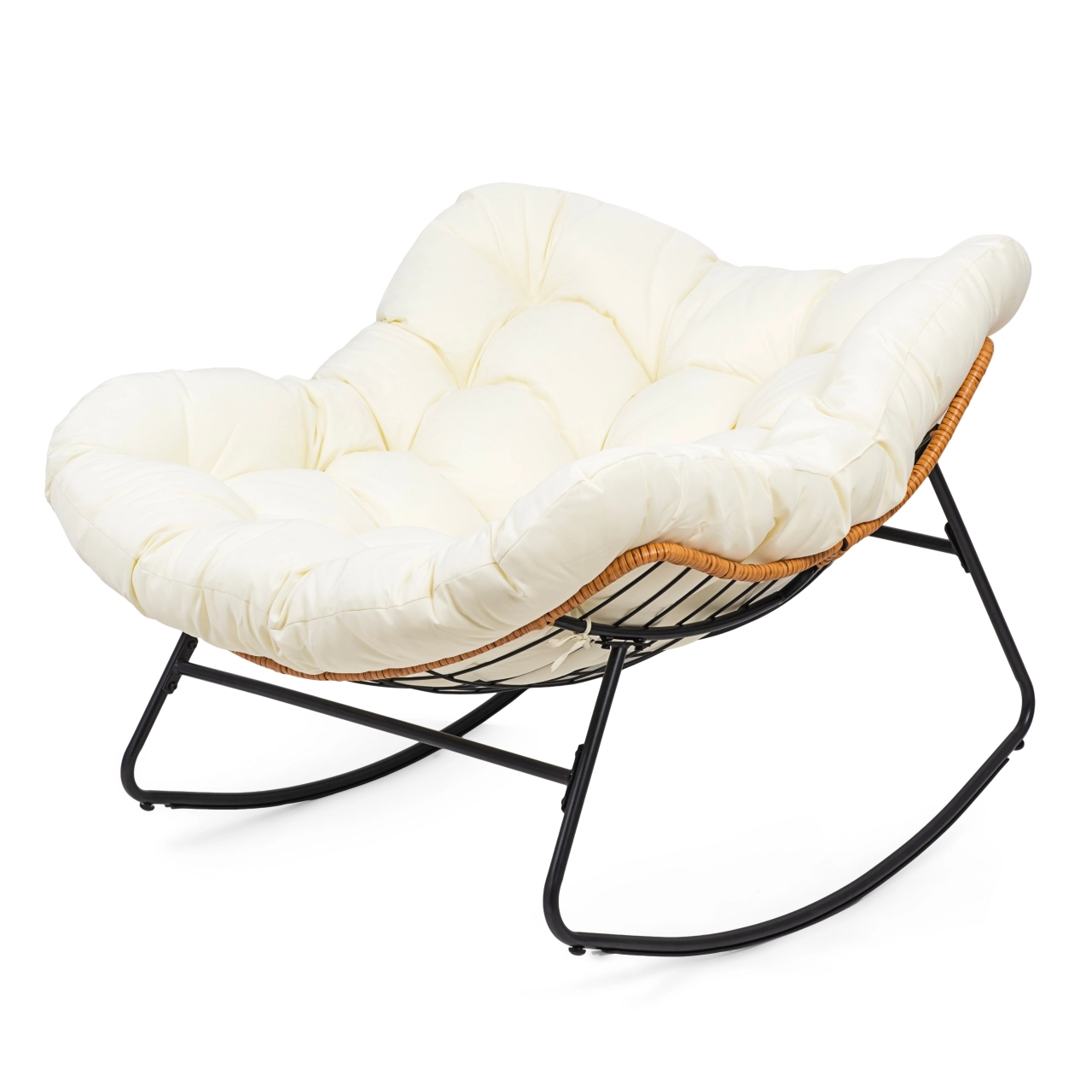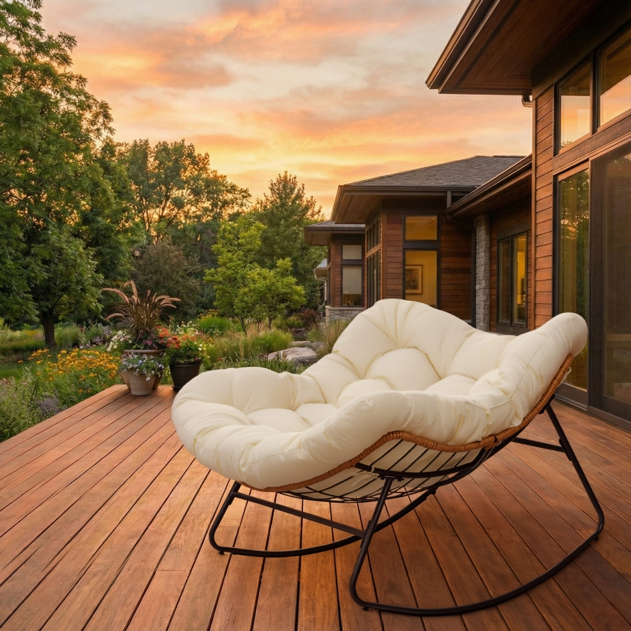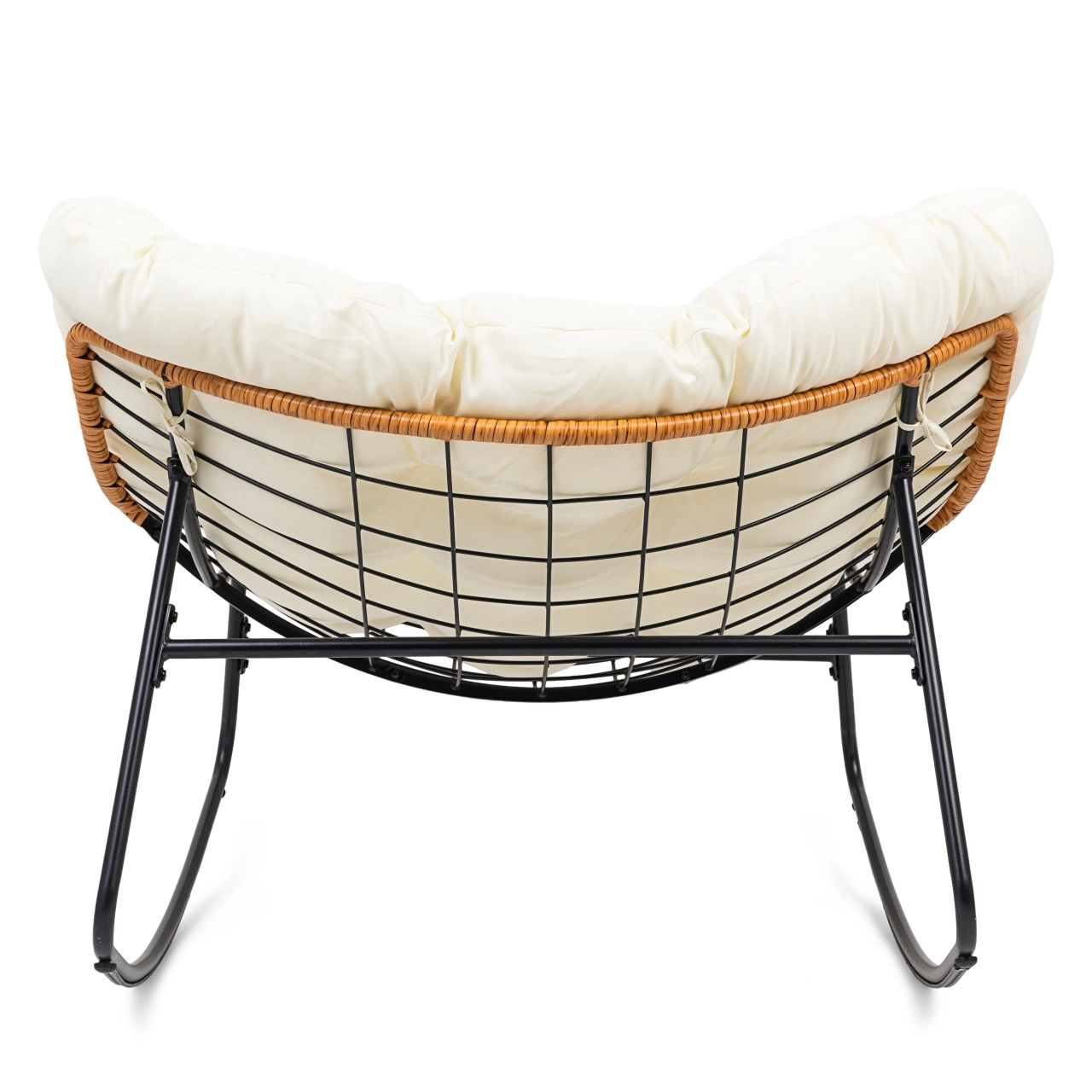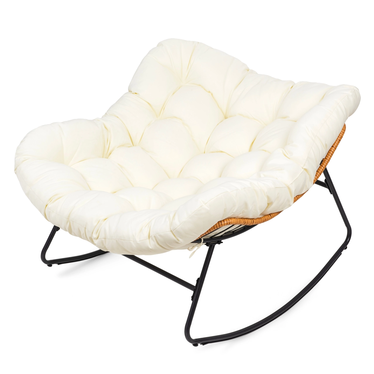 Opdag din private afslapningszone: XL-gyngestolen tilbyder dyb, redeagtig komfort, blid gyngen til både læsning og hvile samt en neutral beige, der let passer ind i enhver indretning. Stabil metalramme, blød, quiltet pude og luftig openwork-skal med rattan-accent understreger den lette scandi-æstetik.
