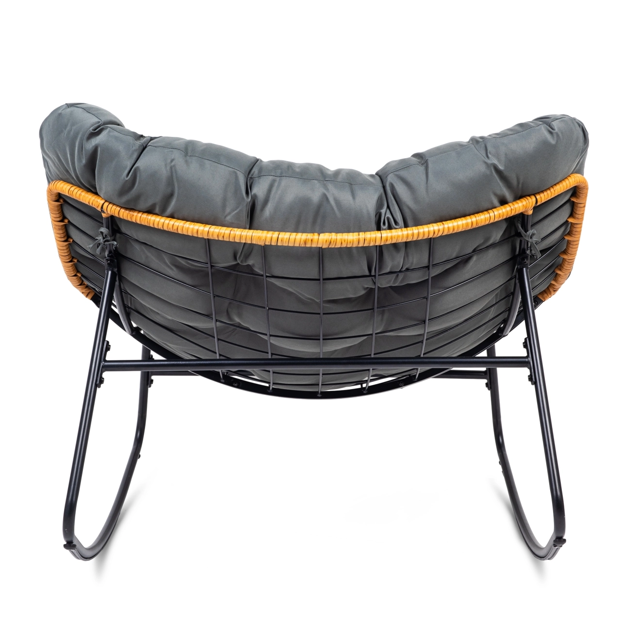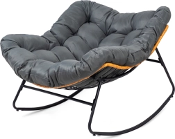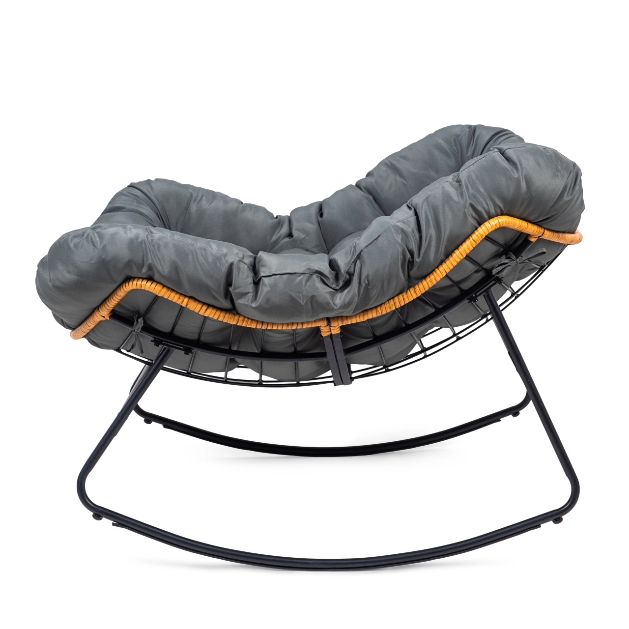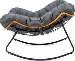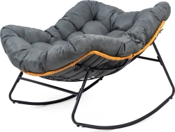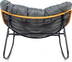 Den skandinaviske XL-gyngestol er designet til maksimal komfort og stil. Det brede og dybe sæde med høj, quiltet polstring omfavner dig behageligt, mens de formede meder giver en jævn og kontrolleret gyngning. Den åbne trådskål med kant i rattan-effekt virker let og moderne.