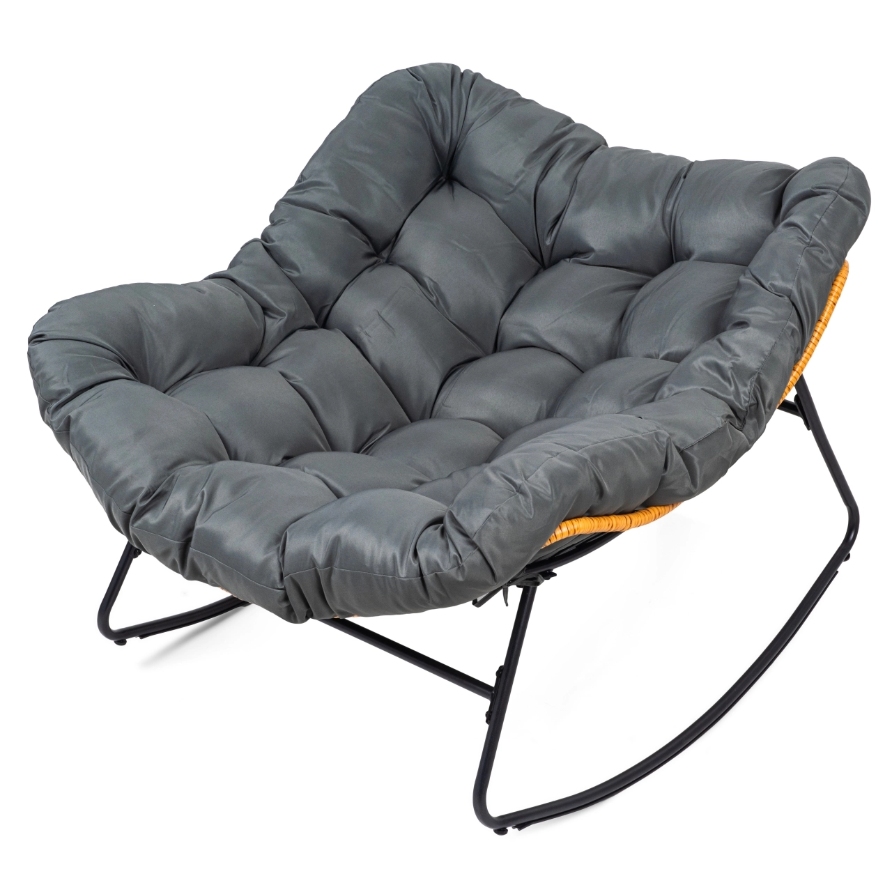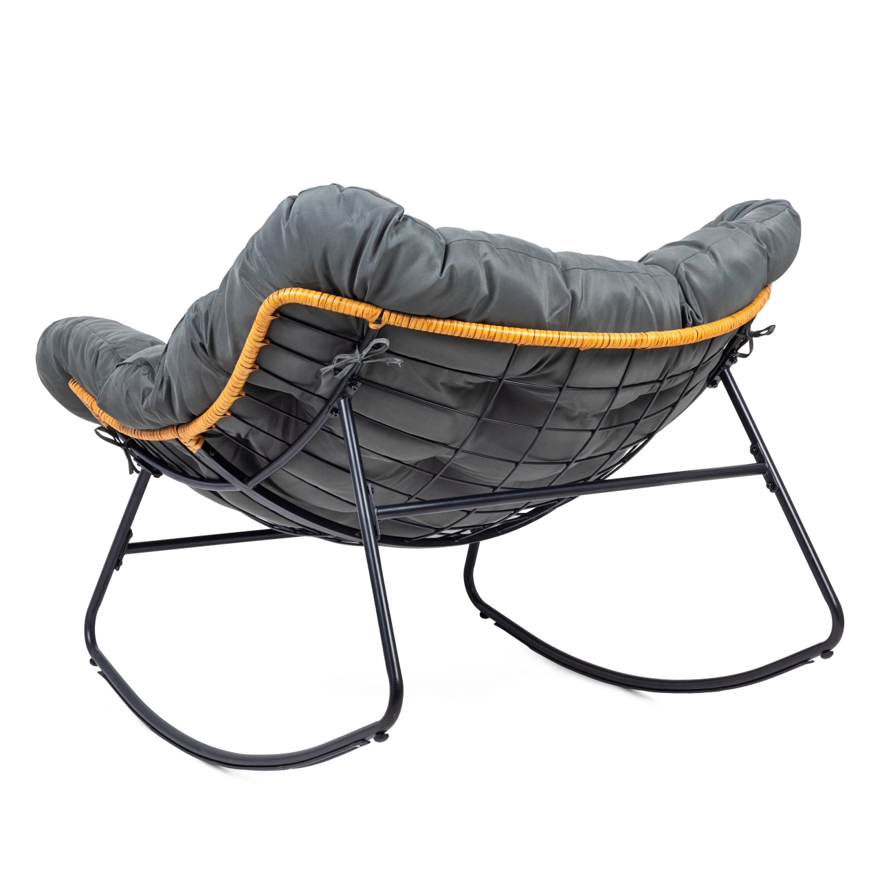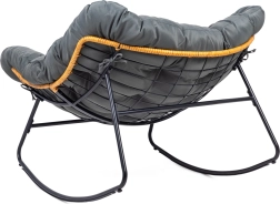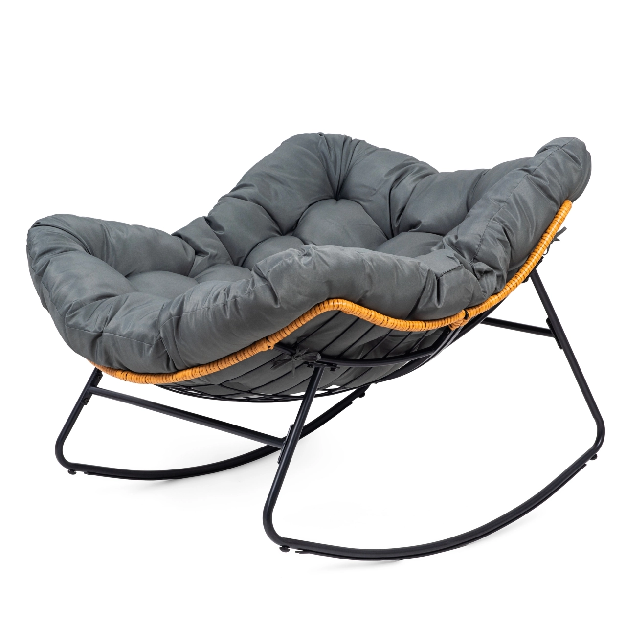 Den skandinaviske XL-gyngestol er designet til maksimal komfort og stil. Det brede og dybe sæde med høj, quiltet polstring omfavner dig behageligt, mens de formede meder giver en jævn og kontrolleret gyngning. Den åbne trådskål med kant i rattan-effekt virker let og moderne.