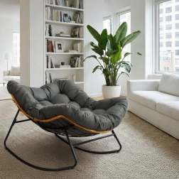 Skab din egen afslapningszone derhjemme. Denne XL-gyngestol tilbyder dybt og rummeligt sæde, blød, quiltet pude og blid, vuggende bevægelse, der hjælper med at afspænde krop og sind. Den neutrale grå passer nemt sammen med træ, sort metal og naturlige accessories, og takket være den luftige konstruktion virker den ikke tung – heller ikke i mindre rum.