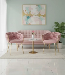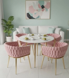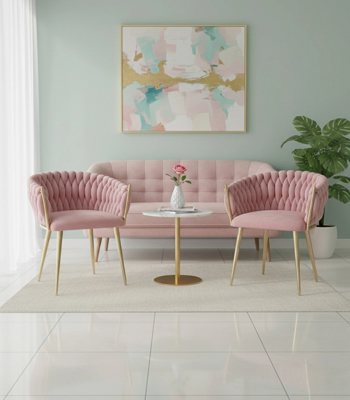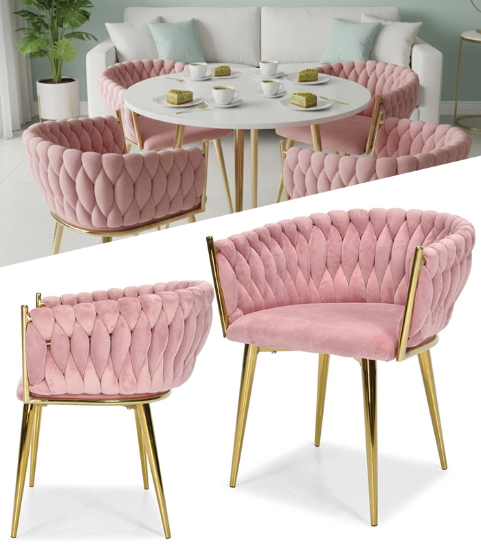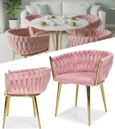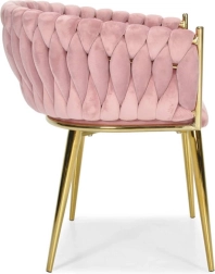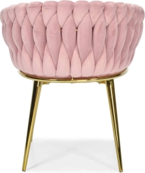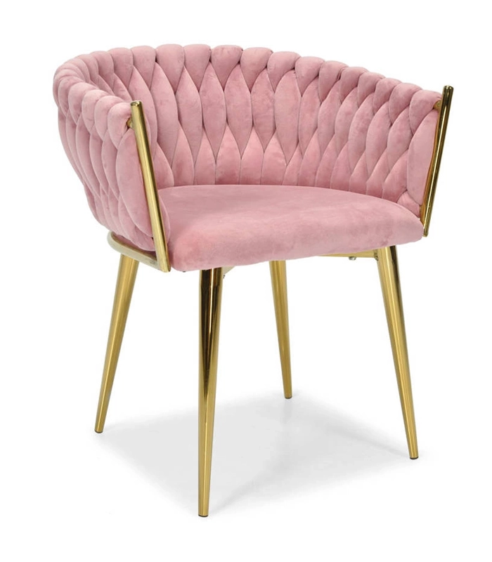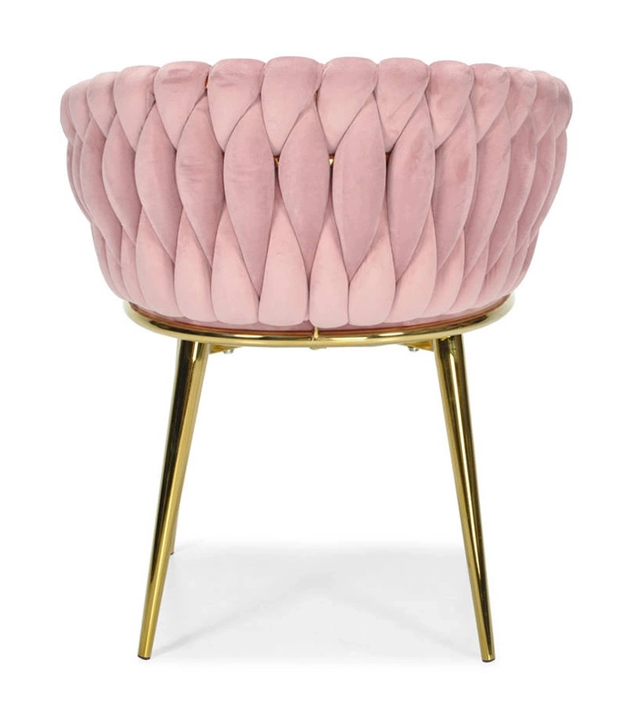 Denne designstol er en ægte juvel i indretningen. Den flettede velourpolstring skaber en iøjnefaldende 3D‑struktur, der straks fanger opmærksomheden og virker særdeles sofistikeret. Pudderrosa farve er diskret og alligevel markant – ideel til både moderne og glamourøse indretninger.
