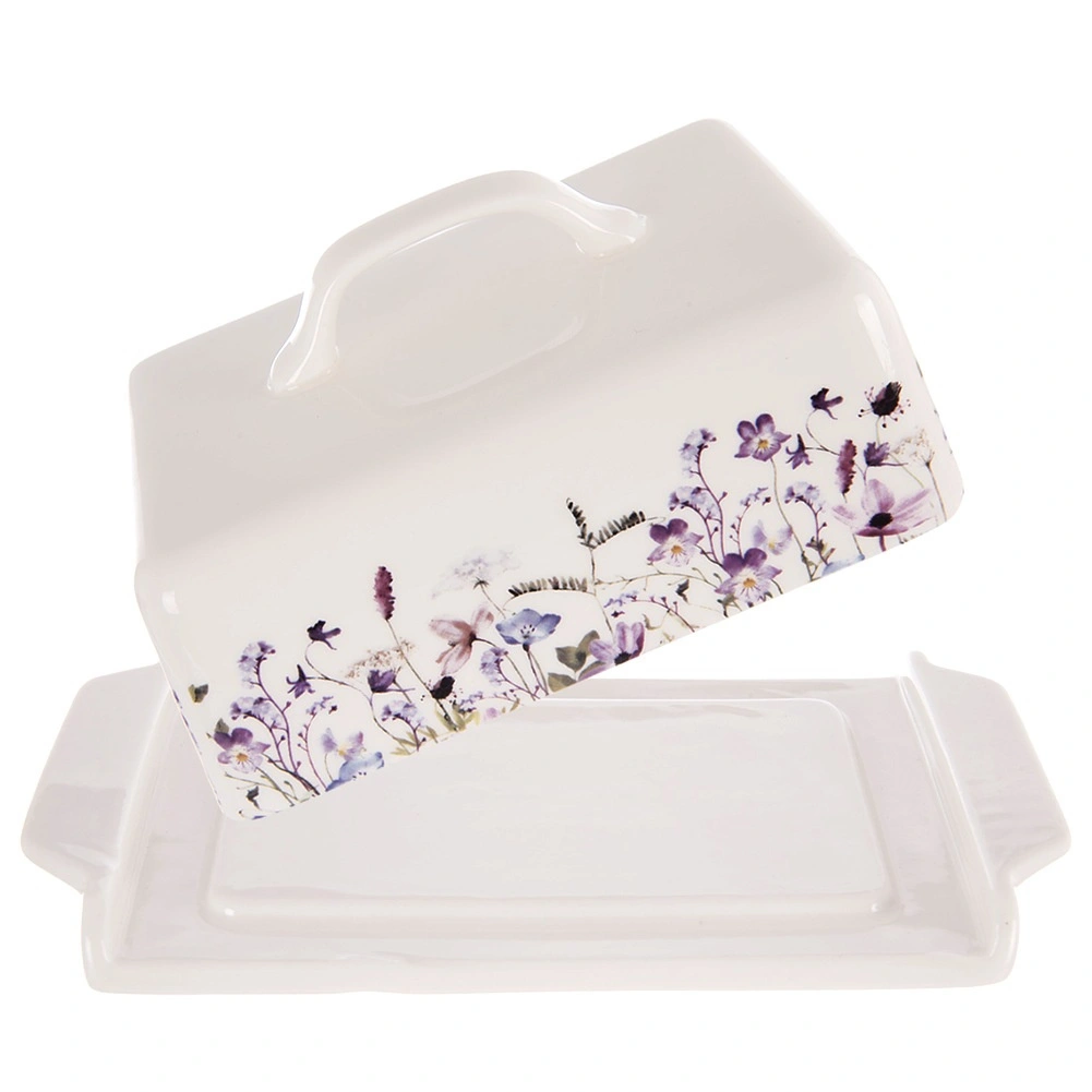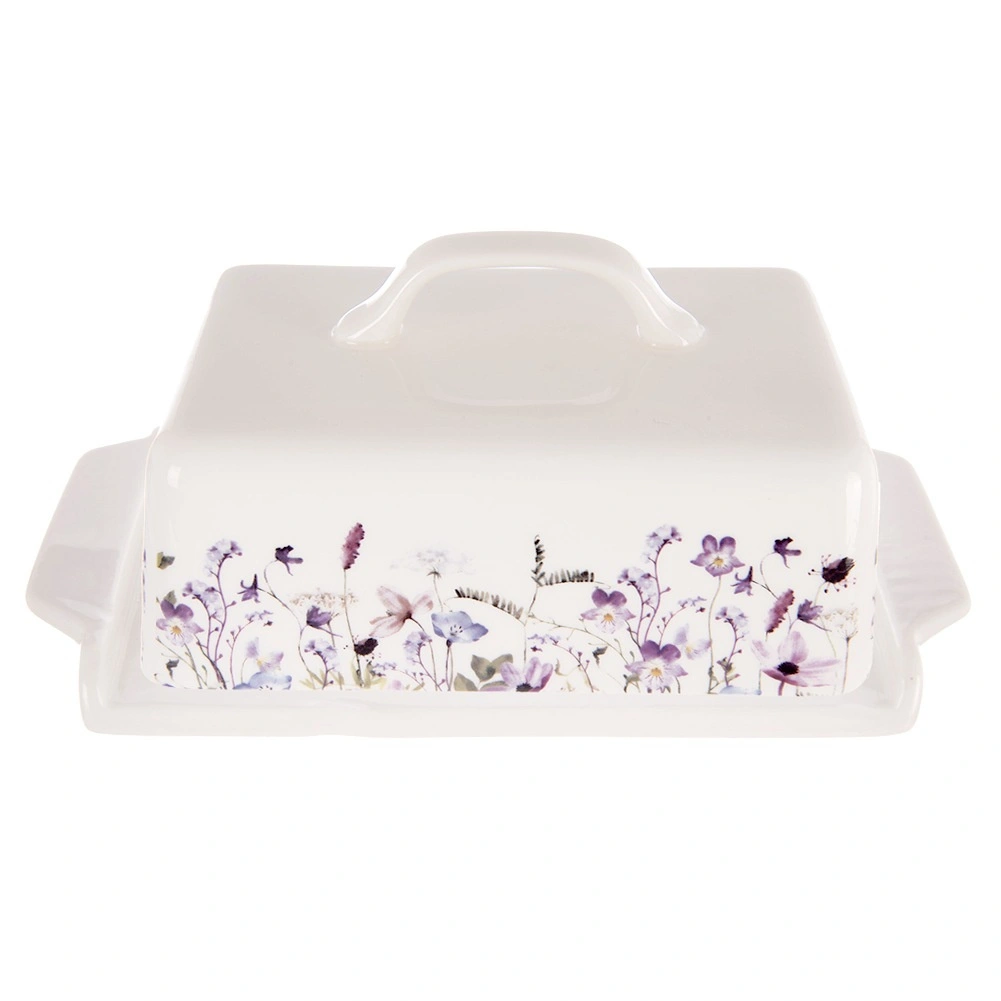 Denne porcelænssmørboks i hvid med et charmerende engblomstermønster er et stilfuldt og funktionelt tilbehør til ethvert køkken. Den holder smørret beskyttet, friskt og klar til servering direkte på bordet. Med låget og det behagelige greb er den let at håndtere, og smørret forbliver hygiejnisk dækket.