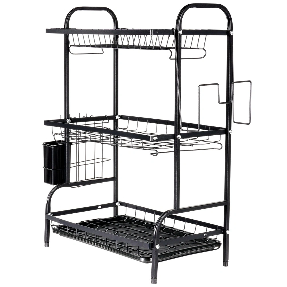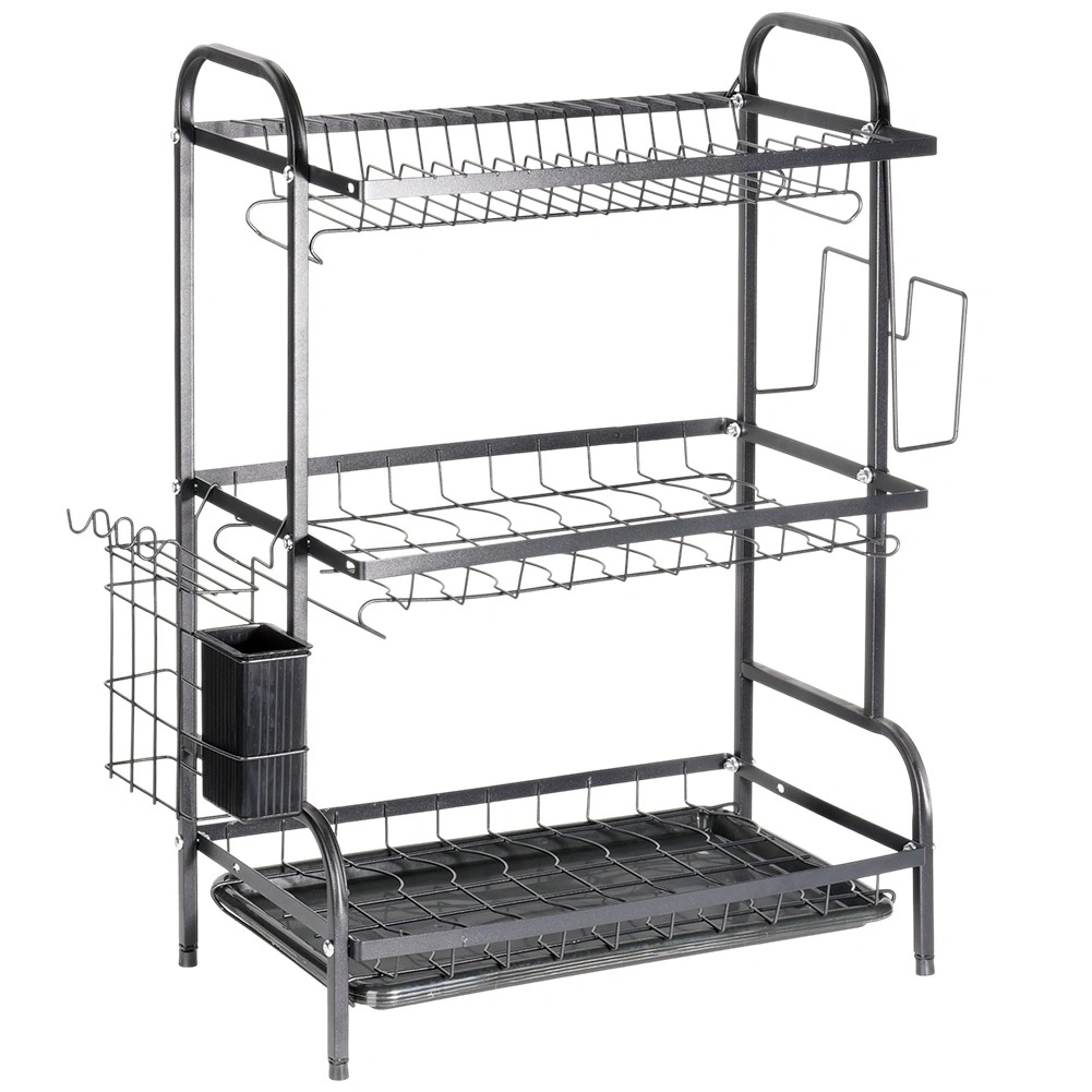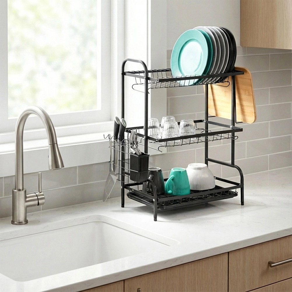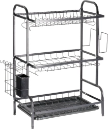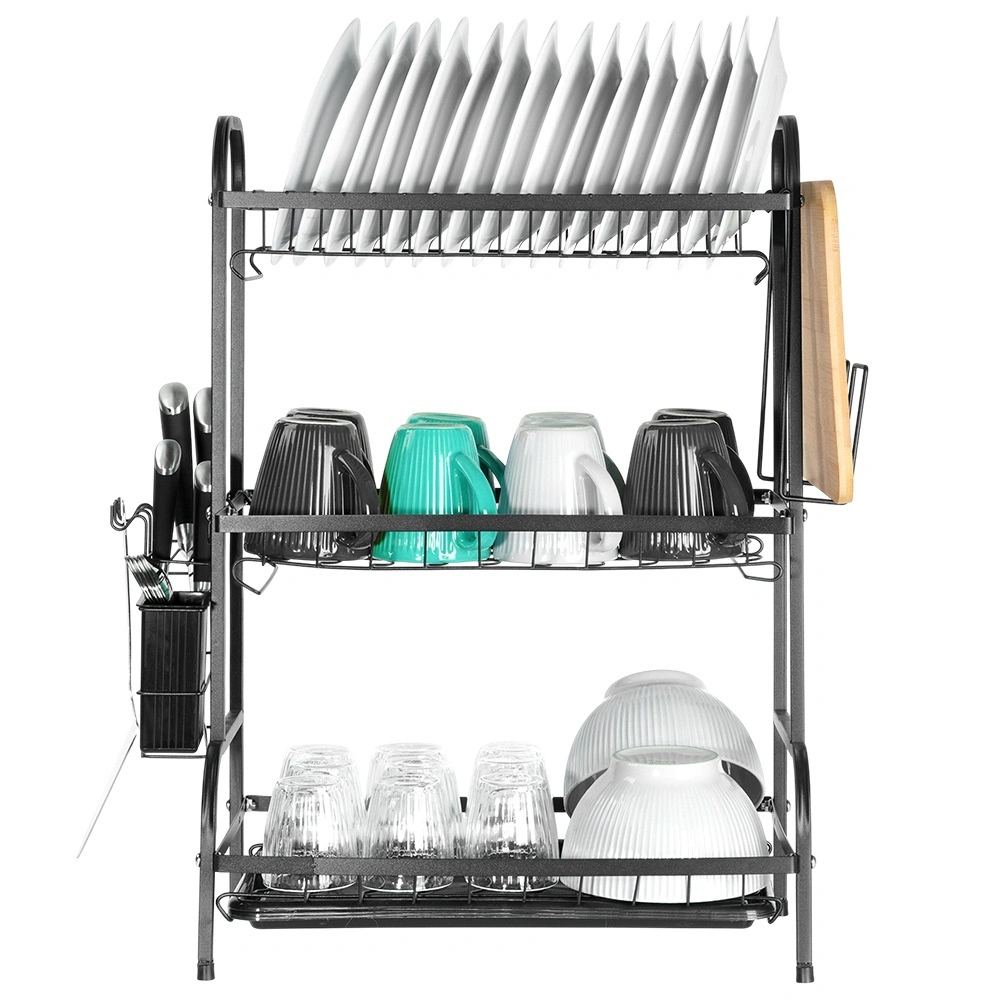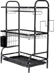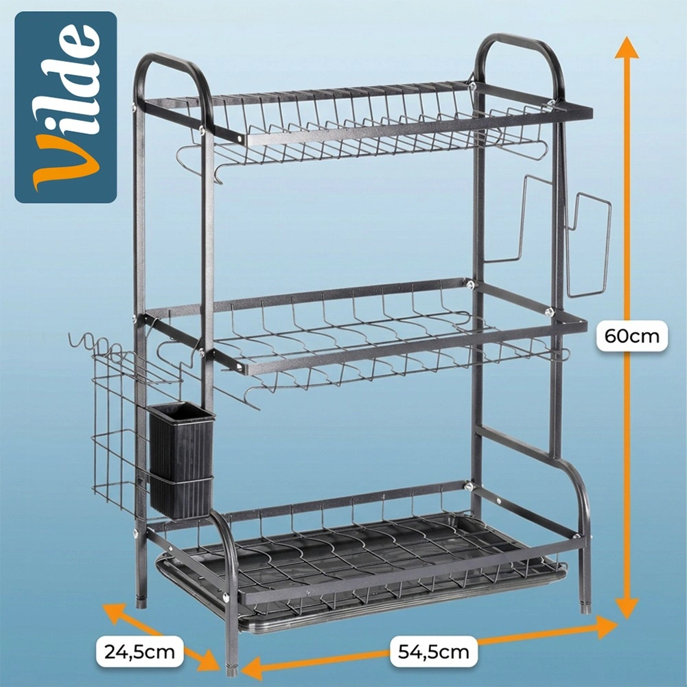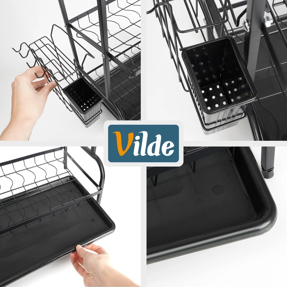 Maksimer pladsen ved vasken med et sort tørrestativ i tre niveauer af holdbart metal. Det øverste niveau rummer op til 16 tallerkener, mens de nederste niveauer er ideelle til skåle, glas og krus. Den aftagelige bestikholder og sideholderen til skærebræt udvider tørrearealet, mens den aftagelige drypbakke opfanger vand og holder bordpladen tør.