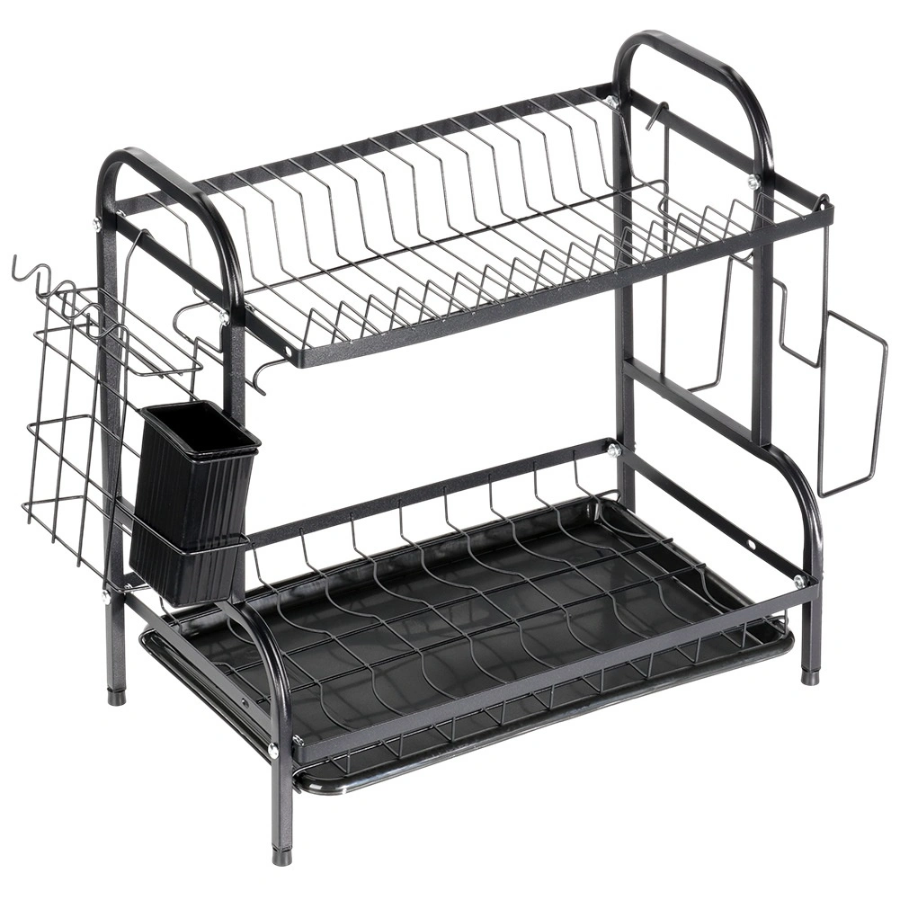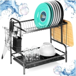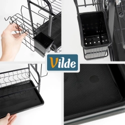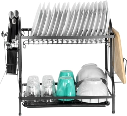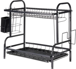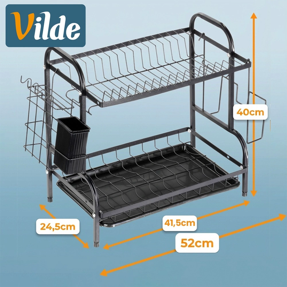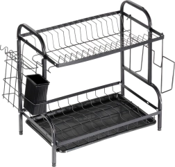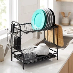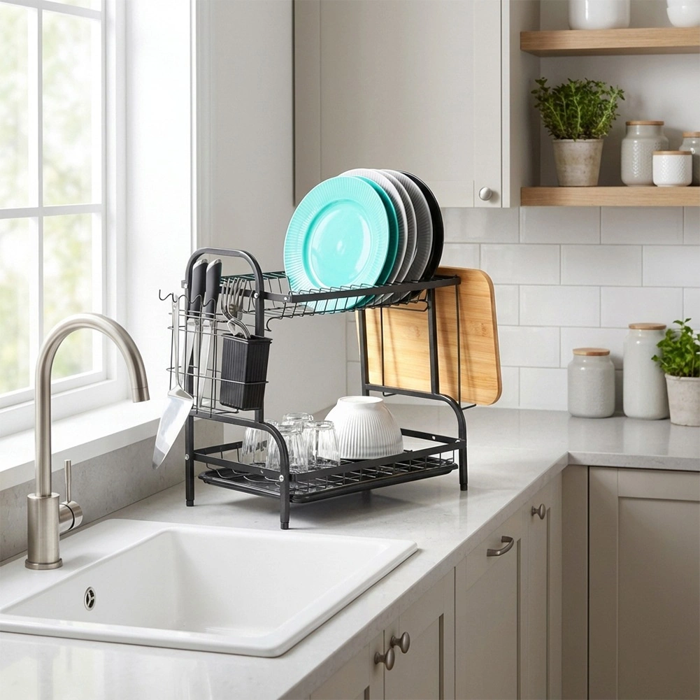 Praktisk to-etagers opvaskestativ i elegant sort, som sparer plads på køkkenbordet og fremskynder tørringen. Det tilbyder øverste stativ til tallerkener, nederste område til skåle og glas, sideholder til skærebræt og en aftagelig bestikkurv. Takket være den plastiske drypbakke forbliver køkkenbordet tørt og rent. Fremstillet af holdbart metal for lang levetid og nem vedligeholdelse. Ideelt til både moderne og klassiske køkkener – stilrent loftdesign, stor kapacitet og effektiv organisering af den daglige opvask.