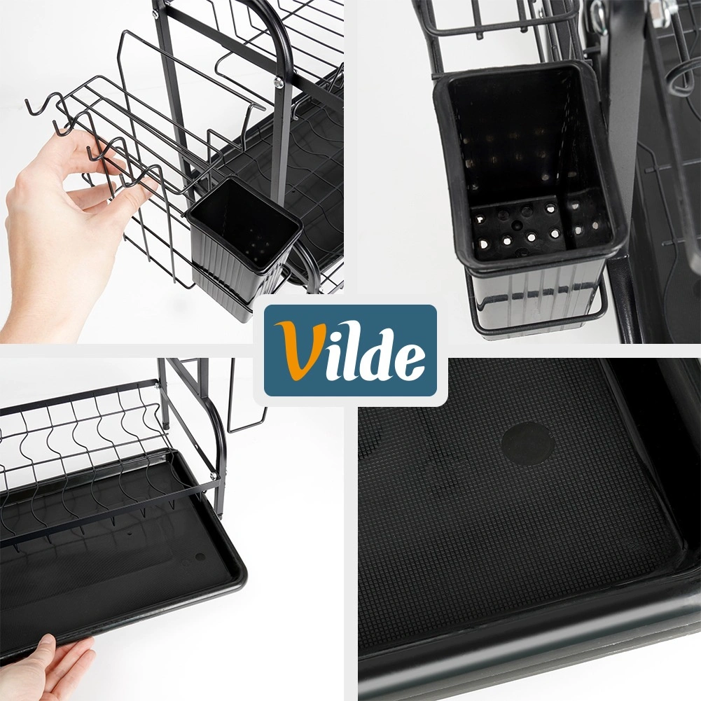 Den robuste metalkonstruktion i mat sort er holdbar og nem at vedligeholde. Den nederste drypbakke i plast opfanger vand og beskytter køkkenbordet mod pletter. Den samlede løsning er ideel til mindre køkkener og hjem, der vil have service pænt organiseret.