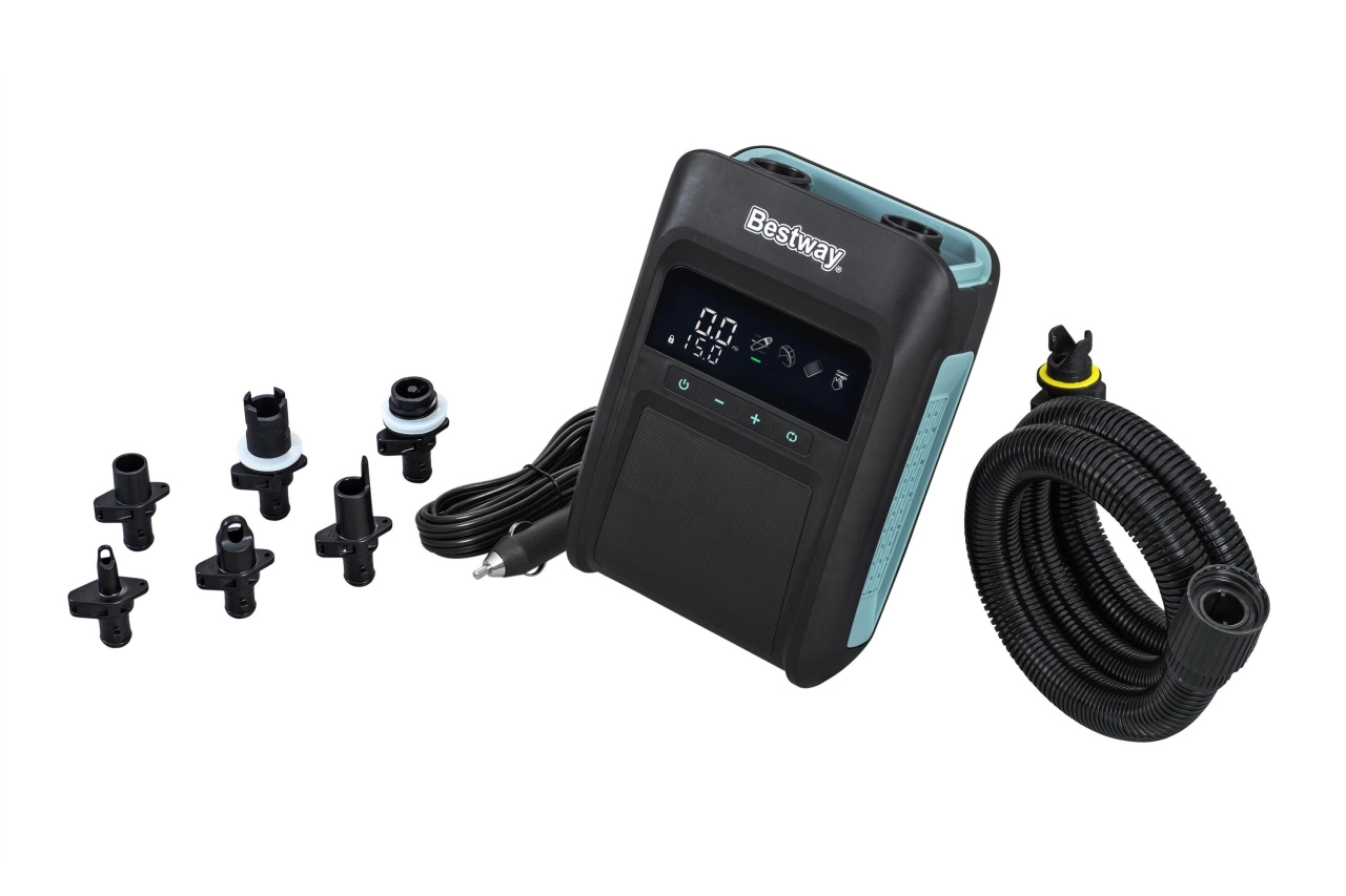 Kraftig elektrisk pumpe BESTWAY PowerGrip til 12 V med digitalt display, automatisk slukning og maks. tryk 20 PSI oppuster hurtigt SUP, både og gummiflåder. Den tilbyder dobbeltmotor, tilstande til lavt og højt tryk og præcis indstilling pr. 0,1 PSI.
