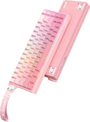 Pladsbesparende skrivebord, holdbare PBT keycaps og iøjnefaldende ARGB-belysning uden flimmer. Ideelt til rejser og et rent setup.