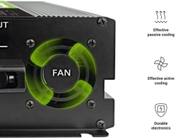 Det robuste metalkabinet med ribber og to blæsere sikrer driftssikkerhed selv ved høj belastning. Medfølgende kabler til tilslutning af batteri.