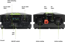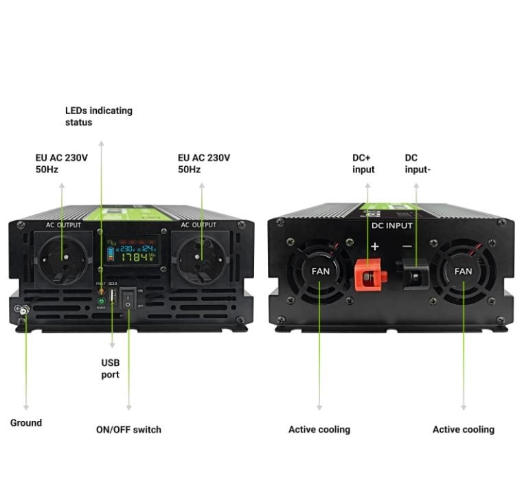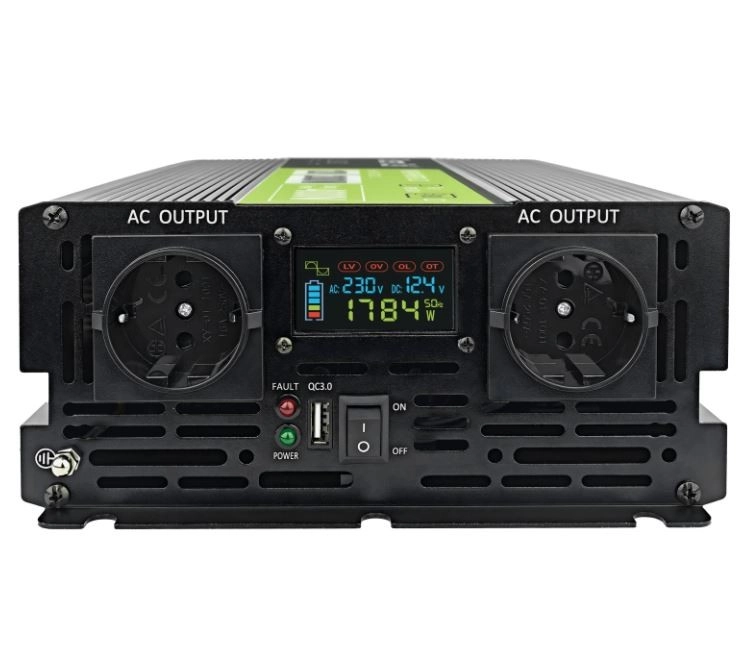 Det integrerede LCD‑display viser spænding, belastning og estimeret batteristatus, så du nemt undgår både underafladning og overbelastning. Det robuste ribbede metalkabinet, to AC‑udtag og effektiv køling giver stabil drift selv ved høj belastning.