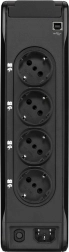 Kapacitet på 1300 VA / 840 W og 4 Schuko-stik + 4 overspændingsudgange gør det muligt pålideligt at forsyne TV, spilkonsoller, PC og anden elektronik uden IEC-adaptere.
