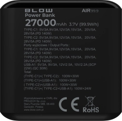 Denne alsidige powerbank med 27.000 mAh kan levere op til 140 W, så den hurtigt oplader ikke kun smartphones, men også mere krævende enheder, inklusive udvalgte laptops. Takket være standarderne PD, QC 3.0 og SCP minimerer du opladningstiden og har strøm ved hånden når som helst og hvor som helst.