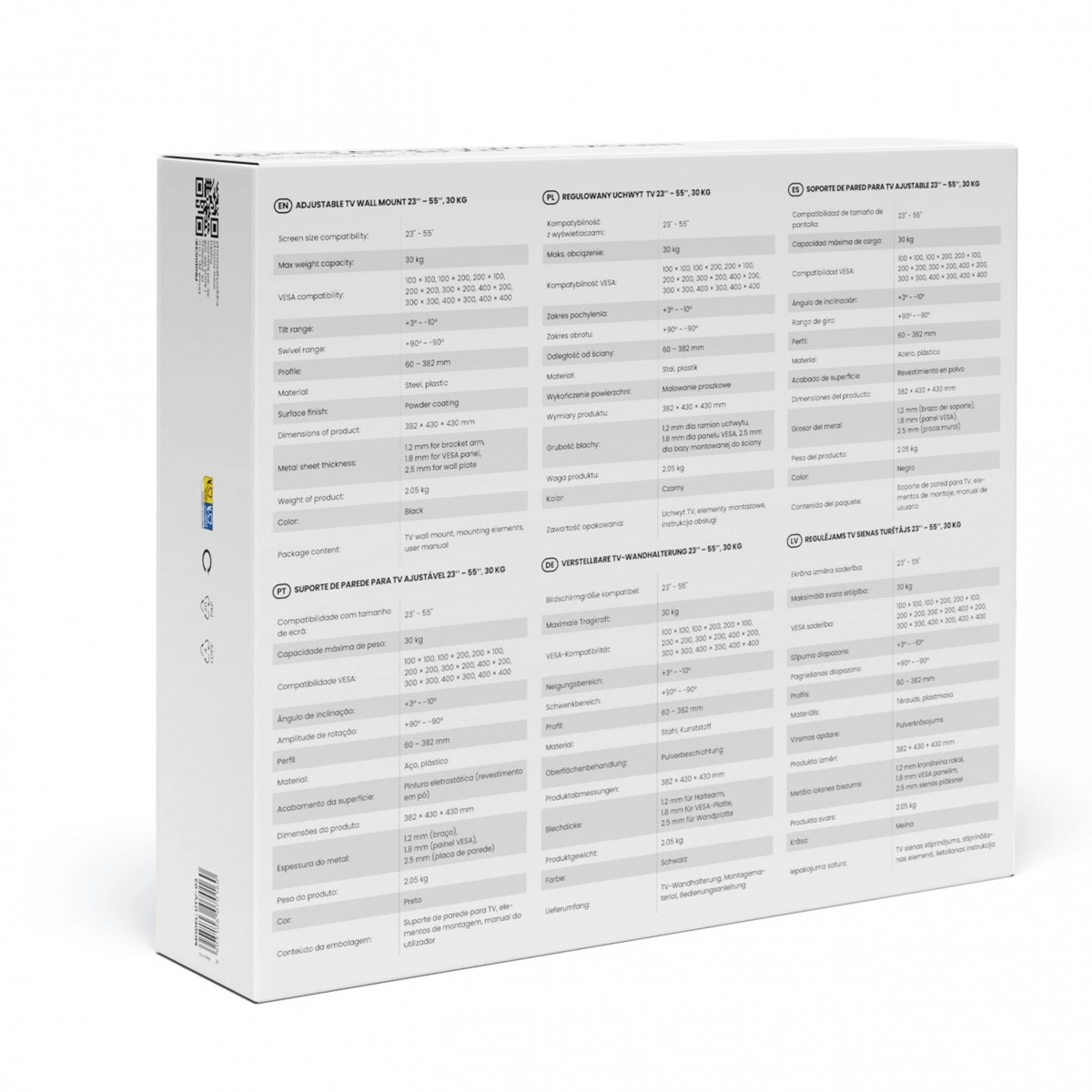 Universelt TV-beslag til skærme med 23–55" med robust stålkonstruktion og bæreevne på 30 kg. Byder på fuld justering: tilt +3° til -10°, drejning op til 90° til begge sider og udtræk 60–382 mm. Kompatibel med VESA 100×100 til 400×400 for hurtig og sikker montering.