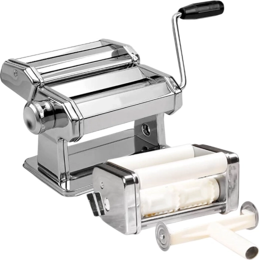 Den manuelle pastamaskine Maestro MR-1679R bringer autentisk fremstilling af frisk pasta ind i dit køkken. Den robuste rustfri stålkonstruktion sikrer lang levetid og stabilitet under brug, mens den trinvise tykkelsesindstilling lader dig finjustere dejpladen efter opskriften – fra tynde tagliolini til brede lasagneplader.