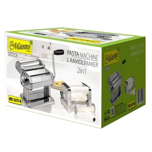 Oplev hjemmelavet pasta med den manuelle 3-i-1 Maestro MR-1679R i rustfrit stål. Den ruller let plader til lasagne, skærer nudler på 2 mm og 6,5 mm, og takket være ravioli-tilbehøret (4,5 × 4,5 cm) laver den ensartede puder. Den tilbyder 9 tykkelsesniveauer (0,3–3 mm) og dejbredde op til 14,5 cm for perfekte resultater.