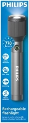 Kompakt genopladelig PHILIPS-lommelygte med opladning via USB‑C, lysstyrke på 770 lm, robust aluminiumshus og integreret 3000 mAh batteri til pålidelig belysning i hjemmet, værkstedet og udendørs.