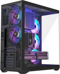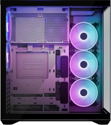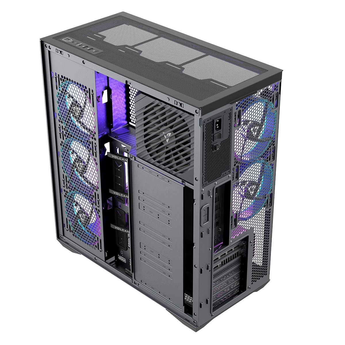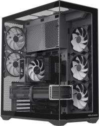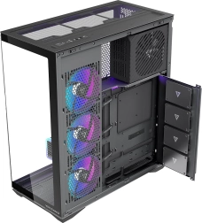 Det indvendige rum er klar til E‑ATX-bundkort, lange grafikkort og omfattende væskekøling med radiatorer op til 420 mm. Den optimerede luftstrøm sikres af fem forinstallerede 140 mm ARGB-blæsere (3× side i reversed konfiguration, 2× bagtil), der holder stabile temperaturer selv under lange gamingsessioner.