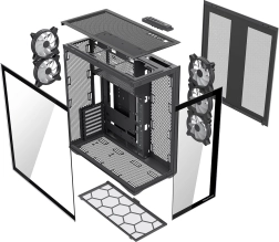 For- og sidepanel i hærdet glas gør din opsætning til et designfokus. Vis komponenter, ARGB-effekter og præcis kabelføring – alt står knivskarpt synligt.