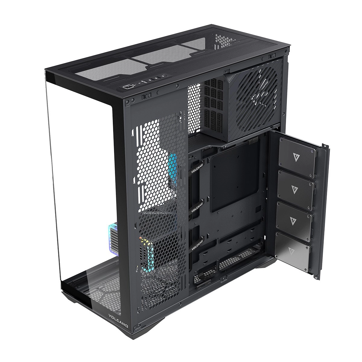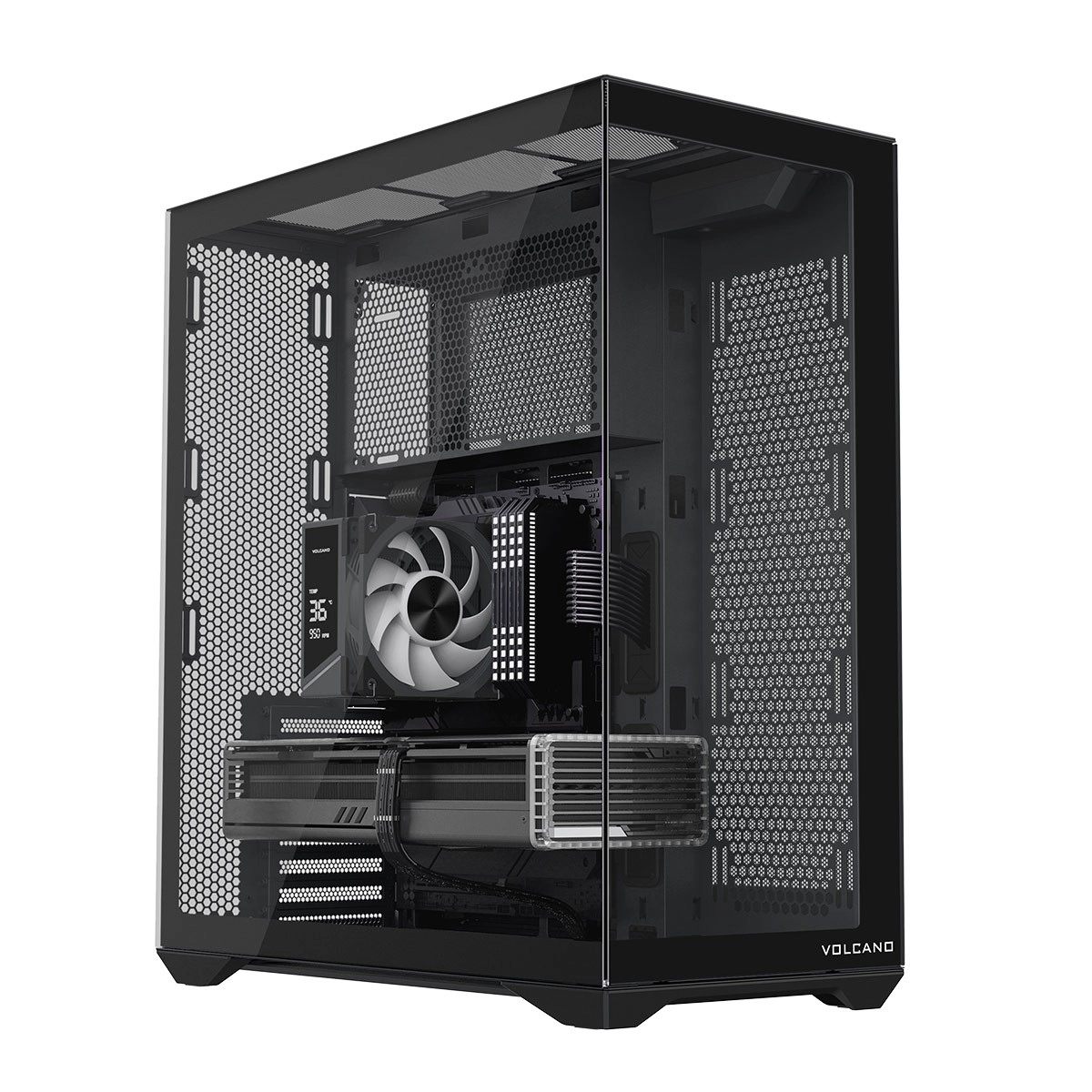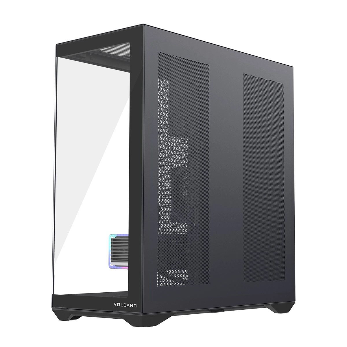 Volcano Space XL giver din konfiguration en fortjent udstillingsscene: front- og sidepanel i hærdet glas fungerer som en vitrine og fremhæver hvert detalje samt ARGB-effekter fra dine blæsere og komponenter. Kabinettet er skabt til personalisering og perfekt orden, inklusive support til bundkort med omvendte stik for skjult kabelføring og et ultrarent look.