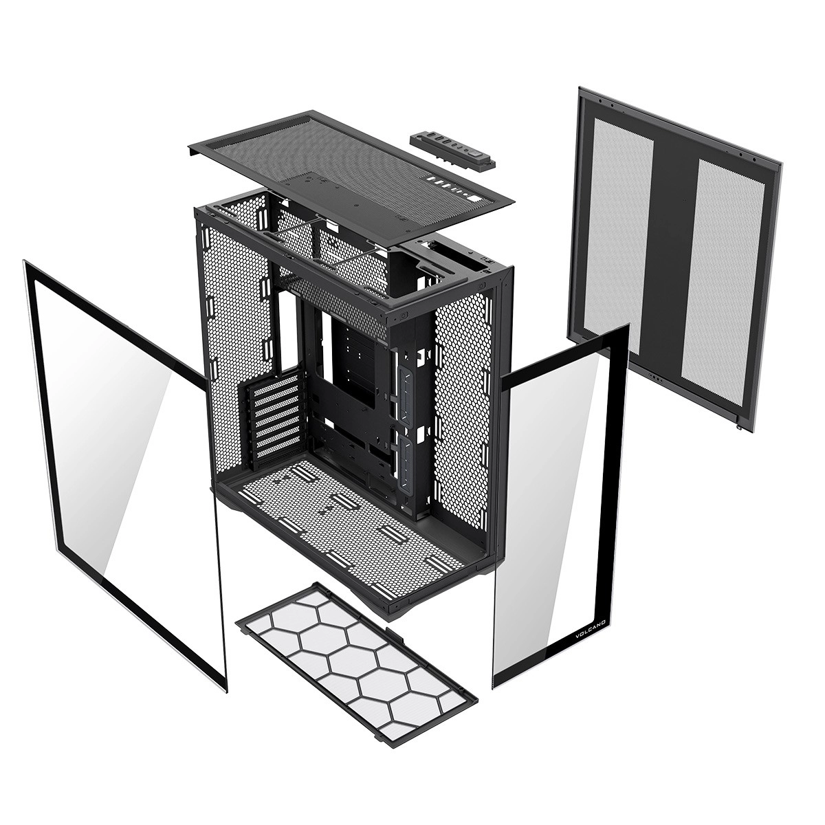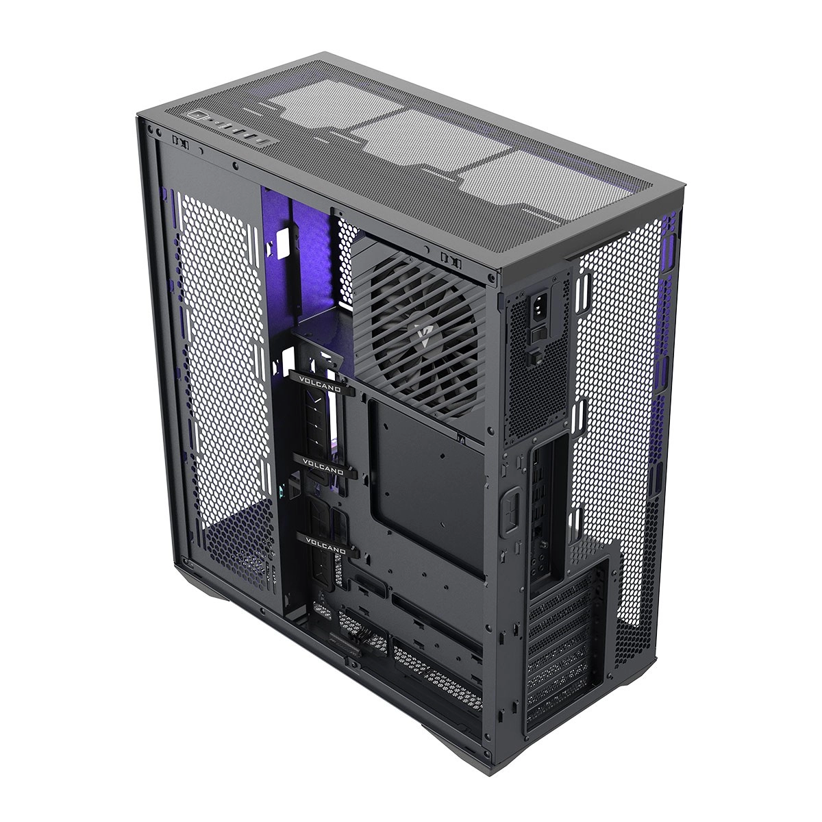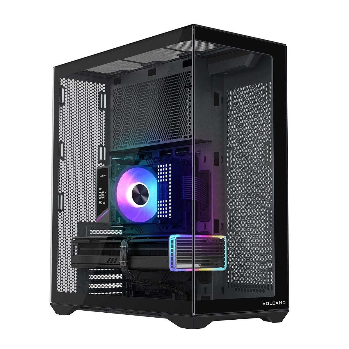Volcano Space XL giver din konfiguration en fortjent udstillingsscene: front- og sidepanel i hærdet glas fungerer som en vitrine og fremhæver hvert detalje samt ARGB-effekter fra dine blæsere og komponenter. Kabinettet er skabt til personalisering og perfekt orden, inklusive support til bundkort med omvendte stik for skjult kabelføring og et ultrarent look.