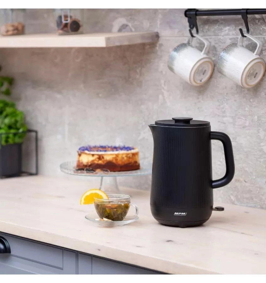 Konstruktionen med dobbelt kappe isolerer effektivt, så vandet forbliver varmt længere, og kogningen er mærkbart mere stille end hos almindelige elkedler.