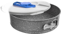 Denne runde springform med låg er ideel til bagning af kager, cheesecakes og kolde desserter. Robust stål med granitsk nonstick-belægning forhindrer fastbrænding og gør rengøringen lettere. Det halvtransparente låg med blåt, nedklappeligt greb muliggør sikker opbevaring og bekvem transport.