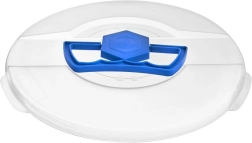 halvtransparent plastlåg (hvidt) med nedklappeligt blåt håndtag