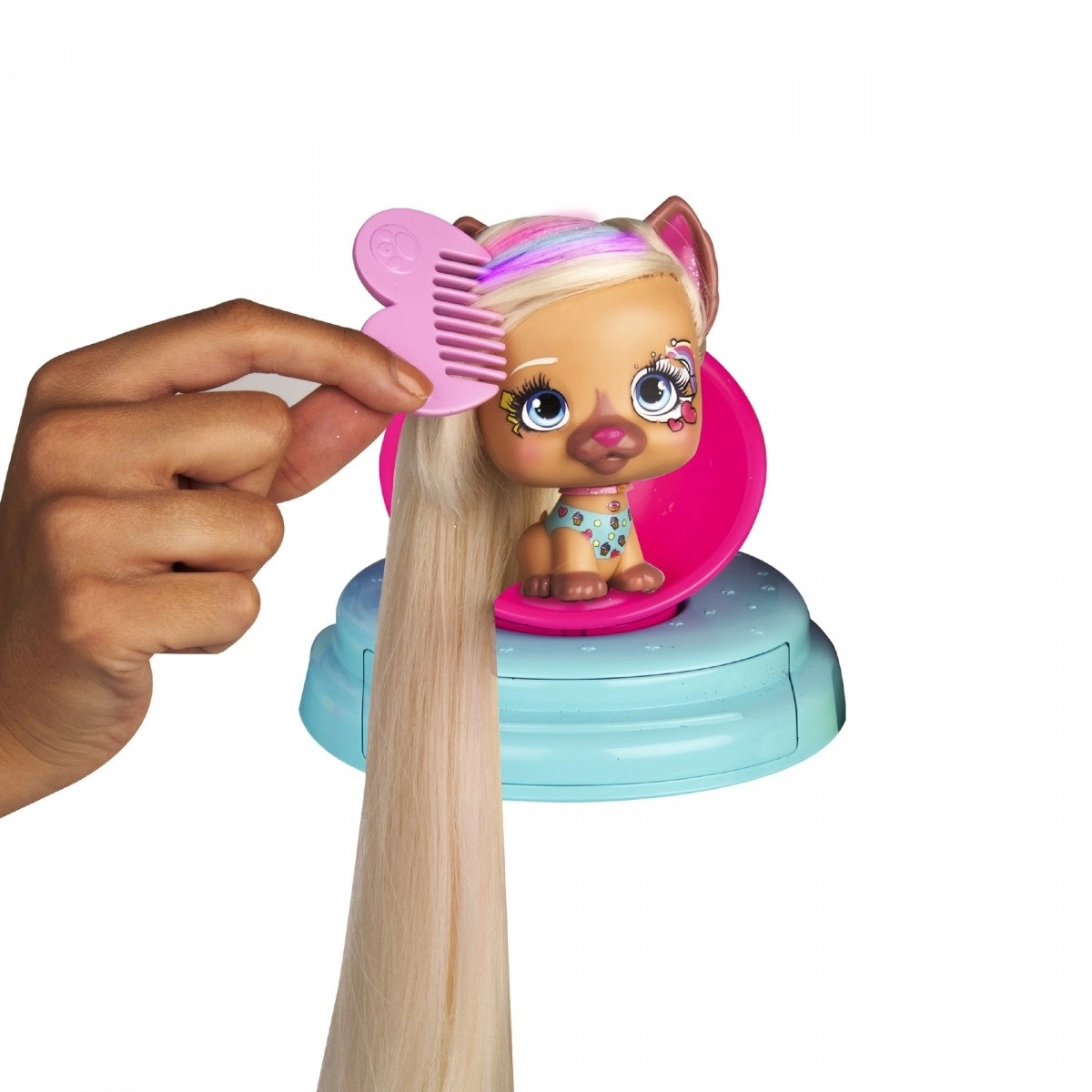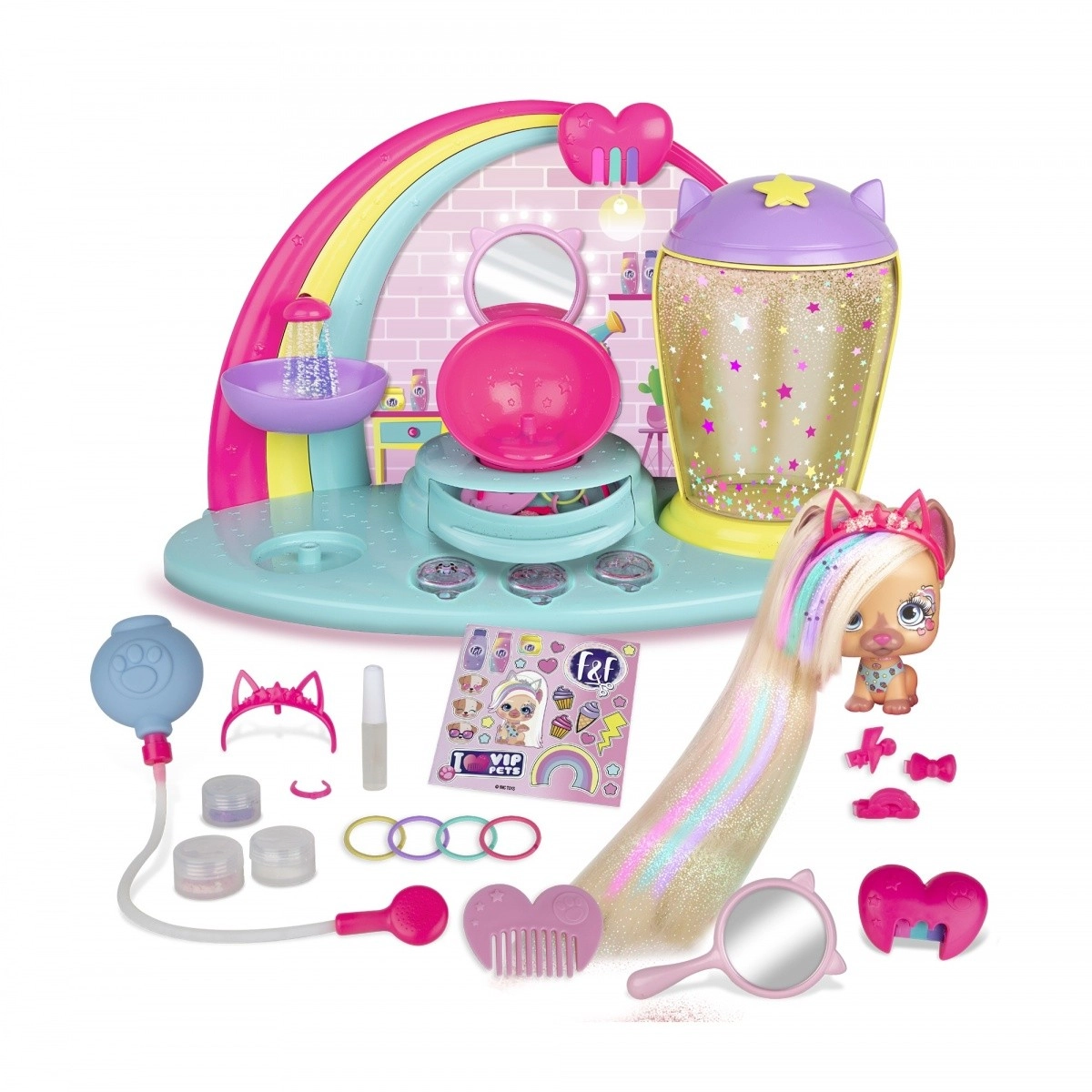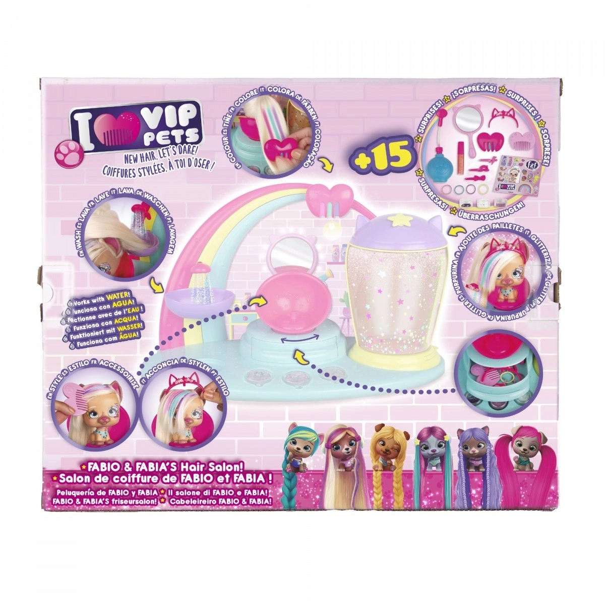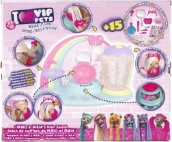 VIP Pets-salonen bringer stemningen fra den populære serie direkte ind på børneværelset. Hovedstjernen er hunden Kiara med platinblondt, 30 cm langt hår, som du kan vaske, farve, rede, flette og pynte. Med den funktionelle frisørvask fugter du nemt håret og skaber farvemagi med regnbuekammen. I glimmerkapslen giver du frisyren en fortryllende glittereffekt.