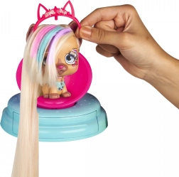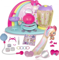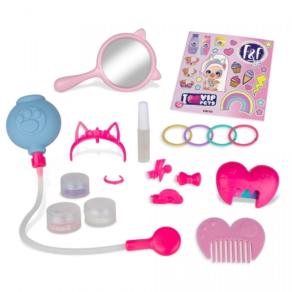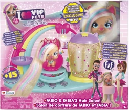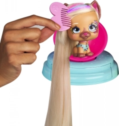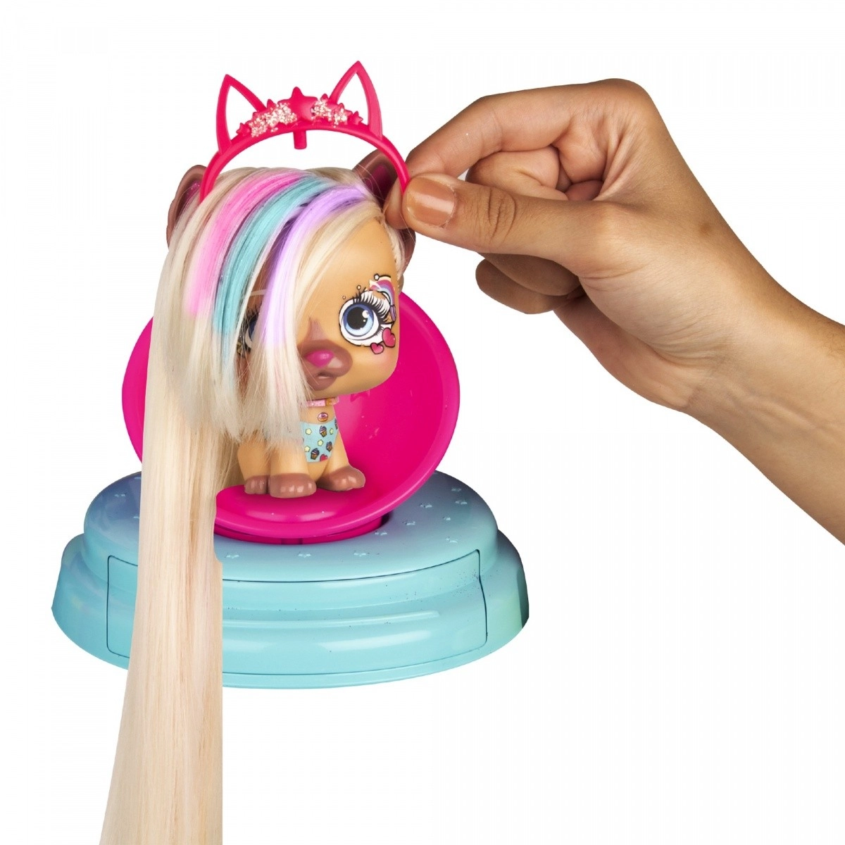 VIP Pets-salonen bringer stemningen fra den populære serie direkte ind på børneværelset. Hovedstjernen er hunden Kiara med platinblondt, 30 cm langt hår, som du kan vaske, farve, rede, flette og pynte. Med den funktionelle frisørvask fugter du nemt håret og skaber farvemagi med regnbuekammen. I glimmerkapslen giver du frisyren en fortryllende glittereffekt.