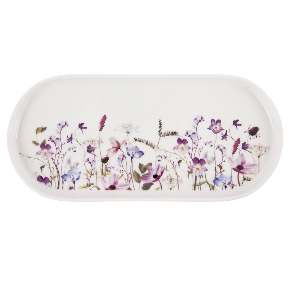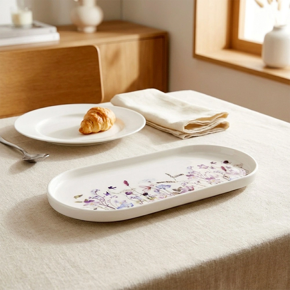 Elegant ovalt porcelænsfad med engblomst-motiv er ideelt til servering af forretter, desserter og snacks. Takket være målene 25 × 12 cm og den let forhøjede kant virker det stilfuldt og er samtidig praktisk. Tåler opvaskemaskine og mikrobølgeovn, porcelæn af høj kvalitet og moderne blomstret design gør det til et fremragende valg til både hverdag og festbord.