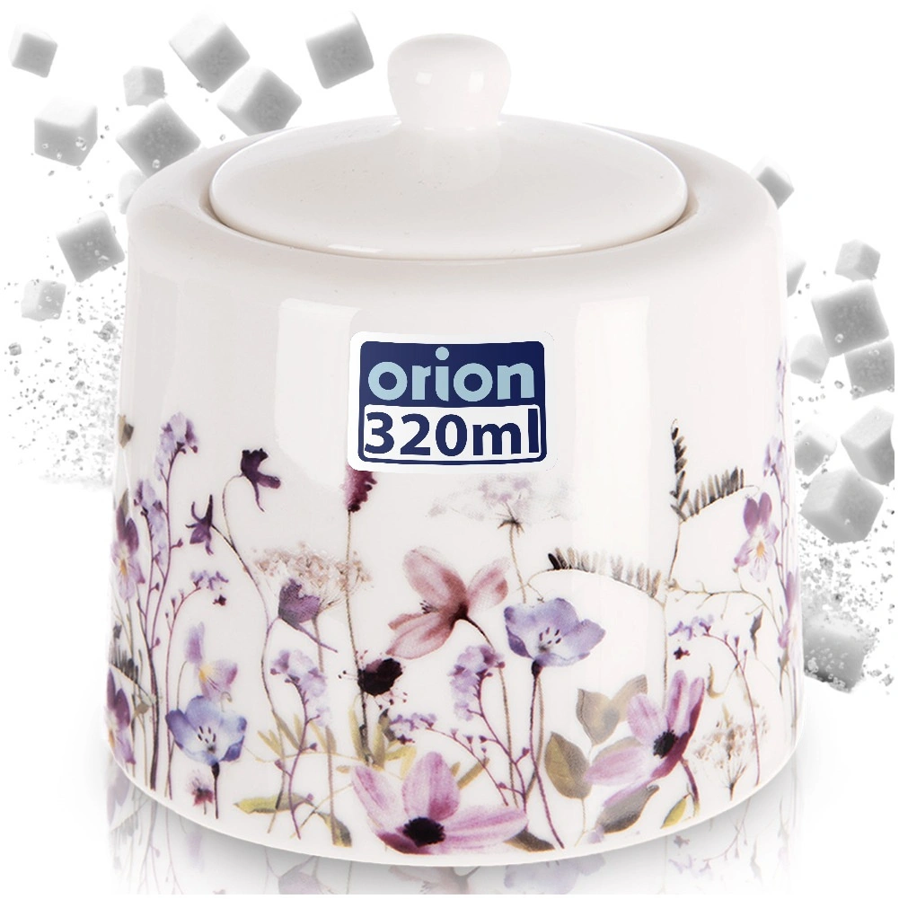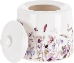 Hvidglaseret porcelæn med motiv af engblomster giver sukkerskålen et elegant udseende og sikrer samtidig nem rengøring og høj holdbarhed.