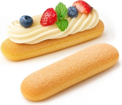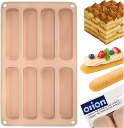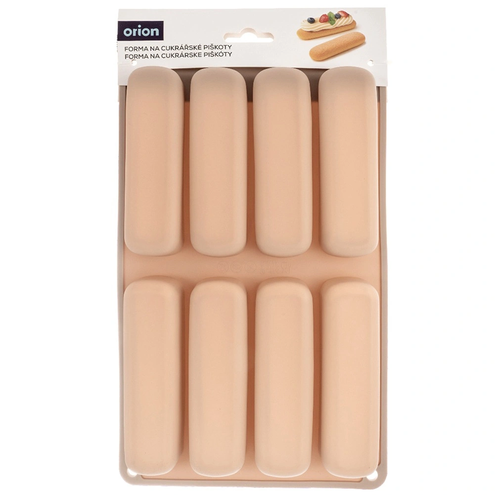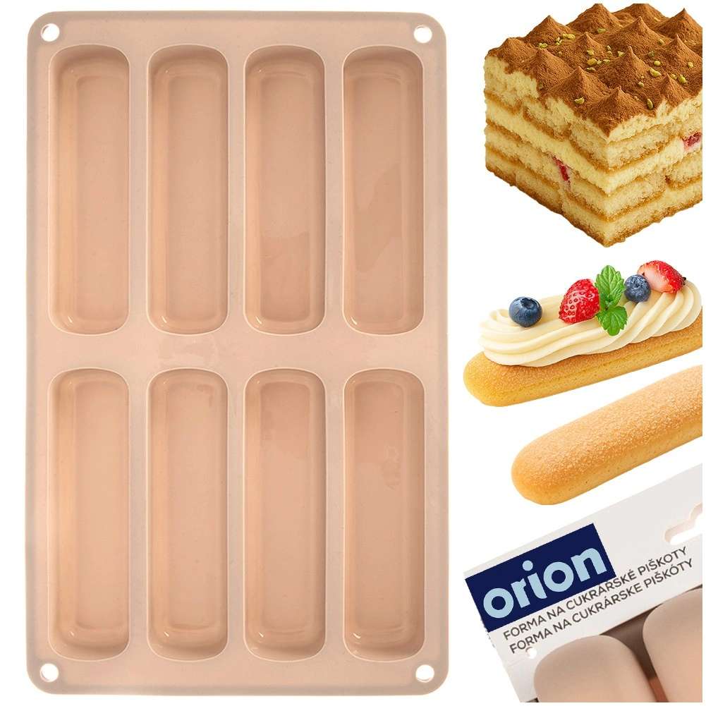 Denne beige silikoneform er ideel til at lave aflange kiks til tiramisu, glasdesserter og klassiske småkager. Formens mål er 28 × 17 × 2 cm, og hvert stykke måler 11,5 × 3 × 2 cm. Materialet er let, fleksibelt og holdbart, hvilket sikrer jævn bagning og nem udtagning uden at hænge fast.