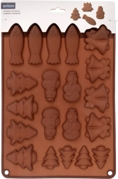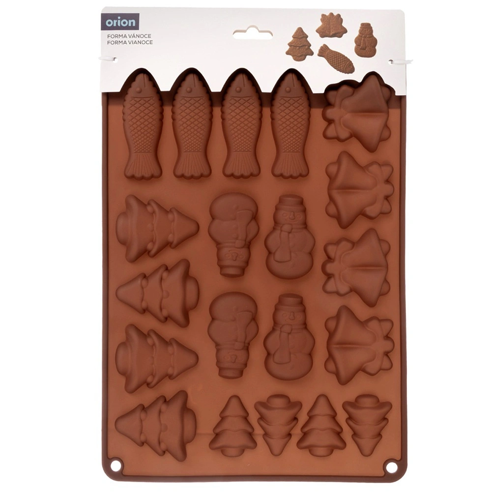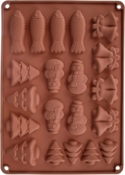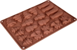 Praktisk silikoneform til nem bagning og støbning af chokolade i vintermotiver. Takket være 20 huller laver du på én gang søde sager i fem former – juletræ, snemand, klokke og fisk. Materialet er non-stick, fleksibelt og varmebestandigt fra -40 til +200 °C, velegnet til ovn, mikroovn og fryser og kan tåle opvaskemaskine.