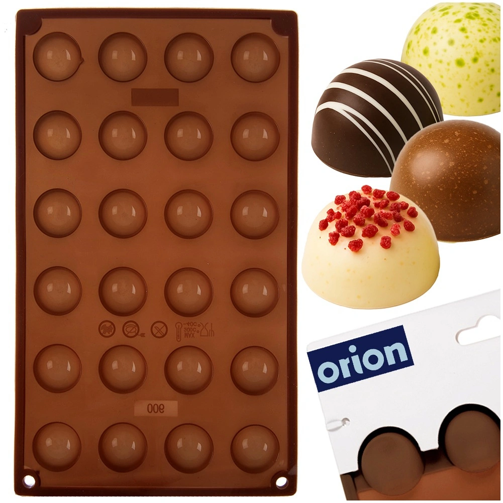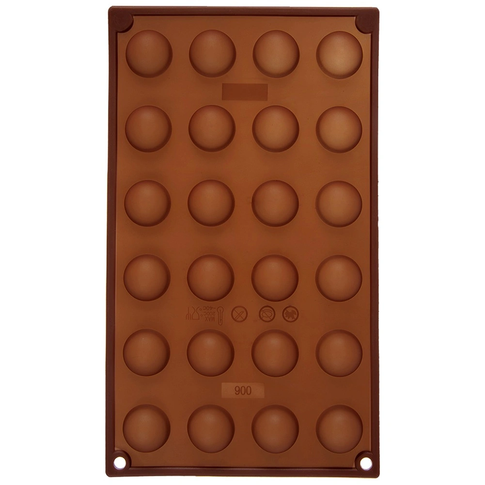 Denne brune silikoneform med målene 30 × 17,5 × 1,5 cm gør det nemt at tilberede elegante halvkugleformede praliner, chokolader eller små desserter med en diameter på ca. 2,8 cm. Takket være det elastiske materiale frigives sødderne nemt og bevarer den perfekte form uden at hænge fast.