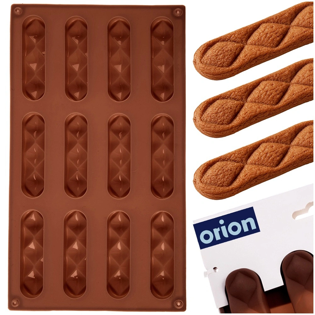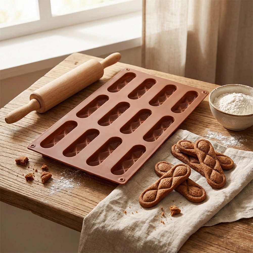 Med denne kvalitetsform i silikone laver du sprøde småkager og hjemmelavede praliner i en elegant, aflang form. Én omgang rummer 12 stykker på cirka 8 × 2 × 1 cm, som takket være den non-stick overflade let kan tages ud uden at knække. Formen sikrer jævn bagning og et smukt mønster med diamantstruktur.