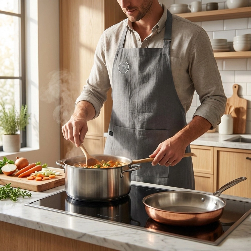 Oplev pålidelig beskyttelse under madlavning med et kvalitetsforklæde i bomuld i en universel pasform til både kvinder og mænd. Materialet i 100% bomuld er behageligt, slidstærkt og let at vaske ved op til 40 °C, så forklædet forbliver som nyt i lang tid. Den justerbare strop med spænde gør det hurtigt og nemt at indstille længden omkring halsen.