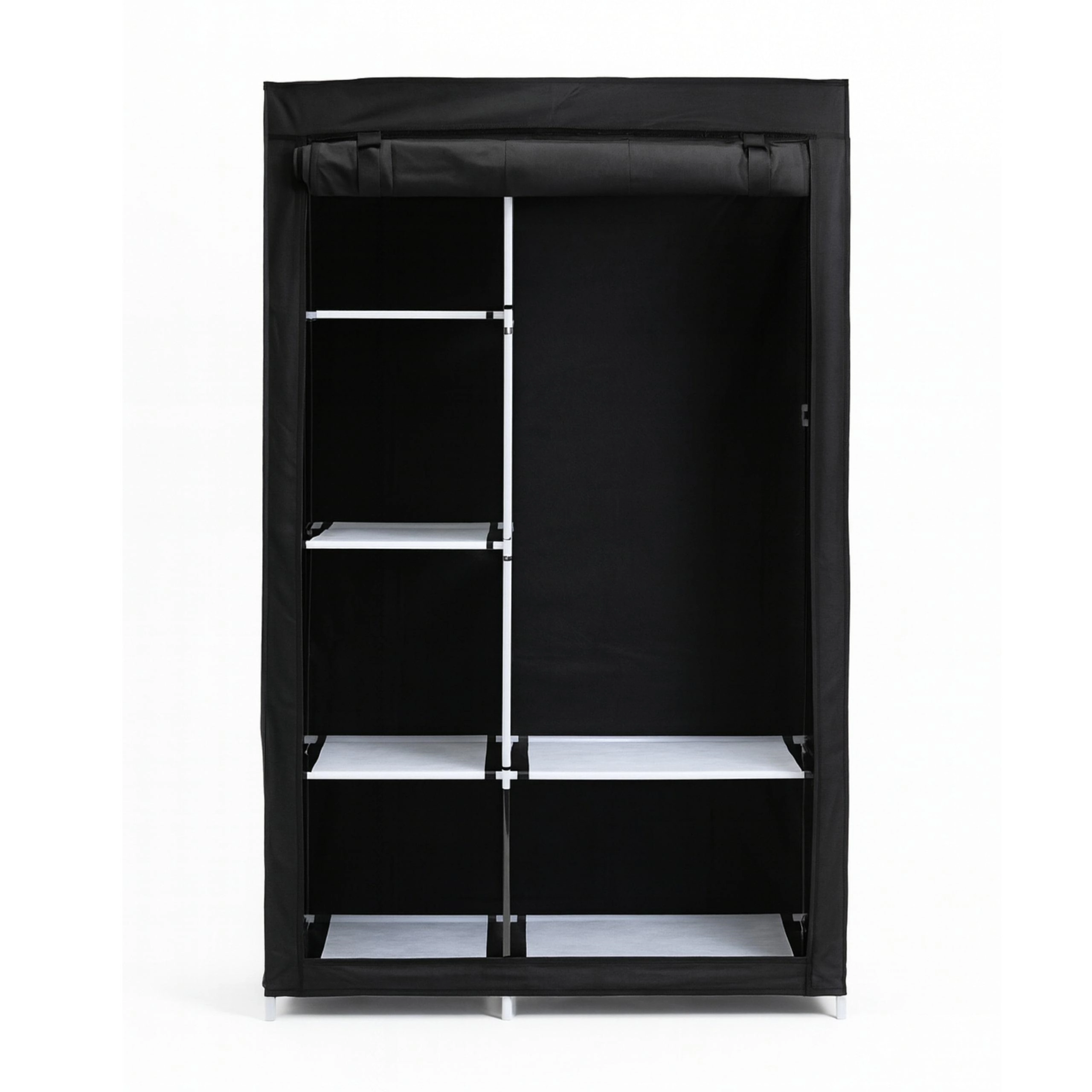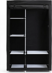 Let og praktisk tekstil-garderobeskab i elegant sort, som byder på en stabil konstruktion, beskyttelse af tøj mod støv og gennemtænkt organisering takket være hylder, sidelommer og bøjlestang. Ideelt til lejlighed, kontor og studieværelse.