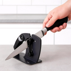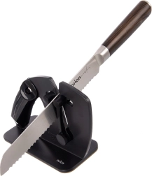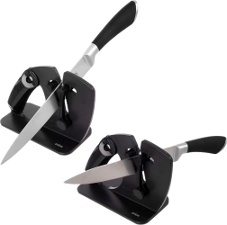 Fjedermechanismen tilpasser sig automatisk bladet og holder den korrekte vinkel for en ensartet og skånsom slibning af både glatte og takkede knive.