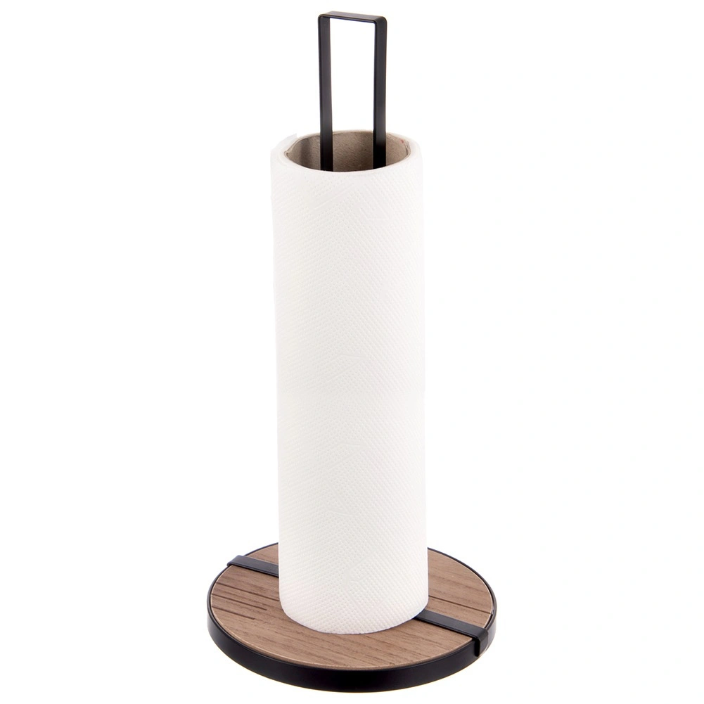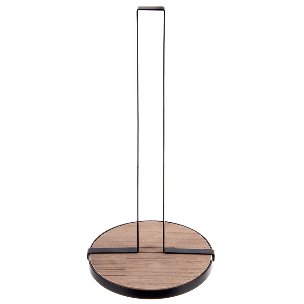 Køkkenrulleholderen LINE med målene 15,5 × 15,5 × 32,5 cm er en praktisk hjælper til hverdagens madlavning og rengøring. Den robuste metalstruktur i sort og den runde træbase af MDF sikrer fremragende stabilitet og lang levetid.
