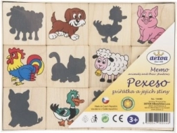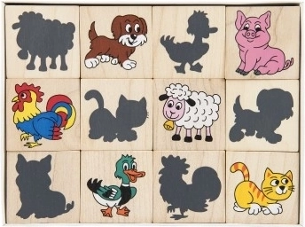 Pexeso af træbrikker med tryk af dyr og deres skygger. Hjælper med at udvikle dine børns fantasi og hukommelse på en sjov måde.