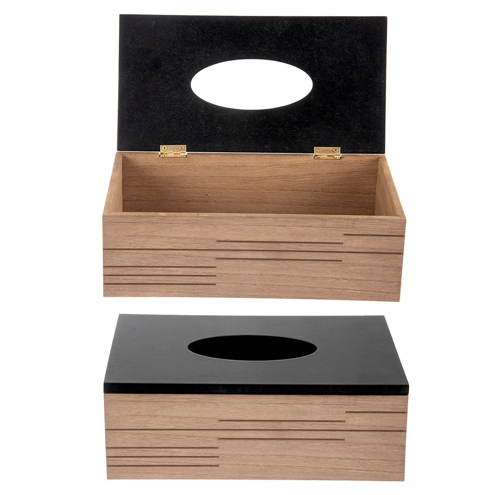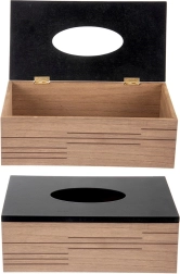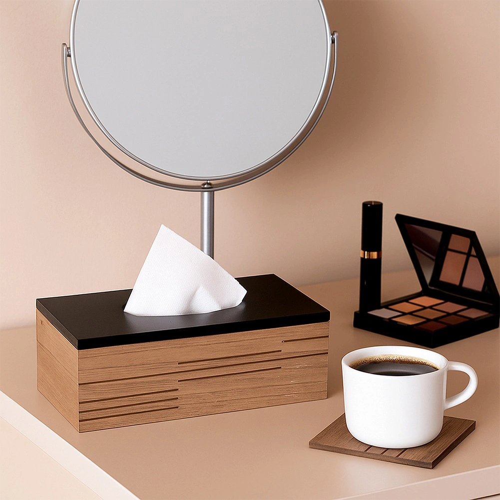 Den stilfulde servietboks Line kombinerer træets varme udtryk med et mat sort låg og forvandler en almindelig æske til et elegant tilbehør. Med målene 25 × 13,5 × 9 cm skjuler den standardpakker med servietter og bevarer et rent udtryk i rummet.